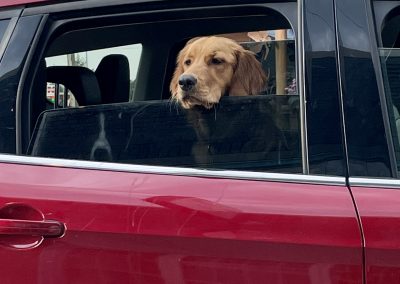 We visited a coffee shop and enjoyed our coffee outside with the car parked nearby, windows down.  Both Rainie & Holly were not shy about making themselves noticeable to coffee shop patrons.  They did very little barking but would stand-up and occasionally place their head out of the window.  It was entertaining to hear the comments from folks, some stopping and asking if they could pet and/or feed them.  The coffee shop owner came out with turkey for each of them creating a new standard of expectations when we went to the ice cream shop!