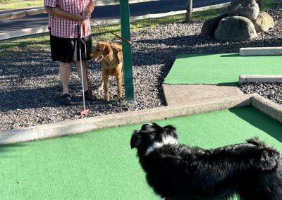 To our liking, Hayward is a dog-friendly town and we took full advantage of it!  Holly and Rainie joined us on the outdoor patio for lunch at the Flat Creek Lodge where we both had an awesome fish sandwich.  Later in the day the dogs joined us on the course for a rousing game of miniature golf.  Holly made it more rousing than we liked at times.  She was determined to chase and catch the golf balls and her determined pulling nearly allowed her to succeed.  At each hole there was a platform & post used by most people as a desk to write down your score.  We used it as a hitching post to wrap my naughty girl’s leash around for added support in holding her back.  Fortunately the course was not busy but we did get a few peoples attention and saw their grins as we fumbled our way through holding Holly back, carrying golf clubs & balls along with a scorecard and small pencil.  Rainie simply followed us around, dragging her leash and finding a shady spot to sit and wait for the commotion to end.