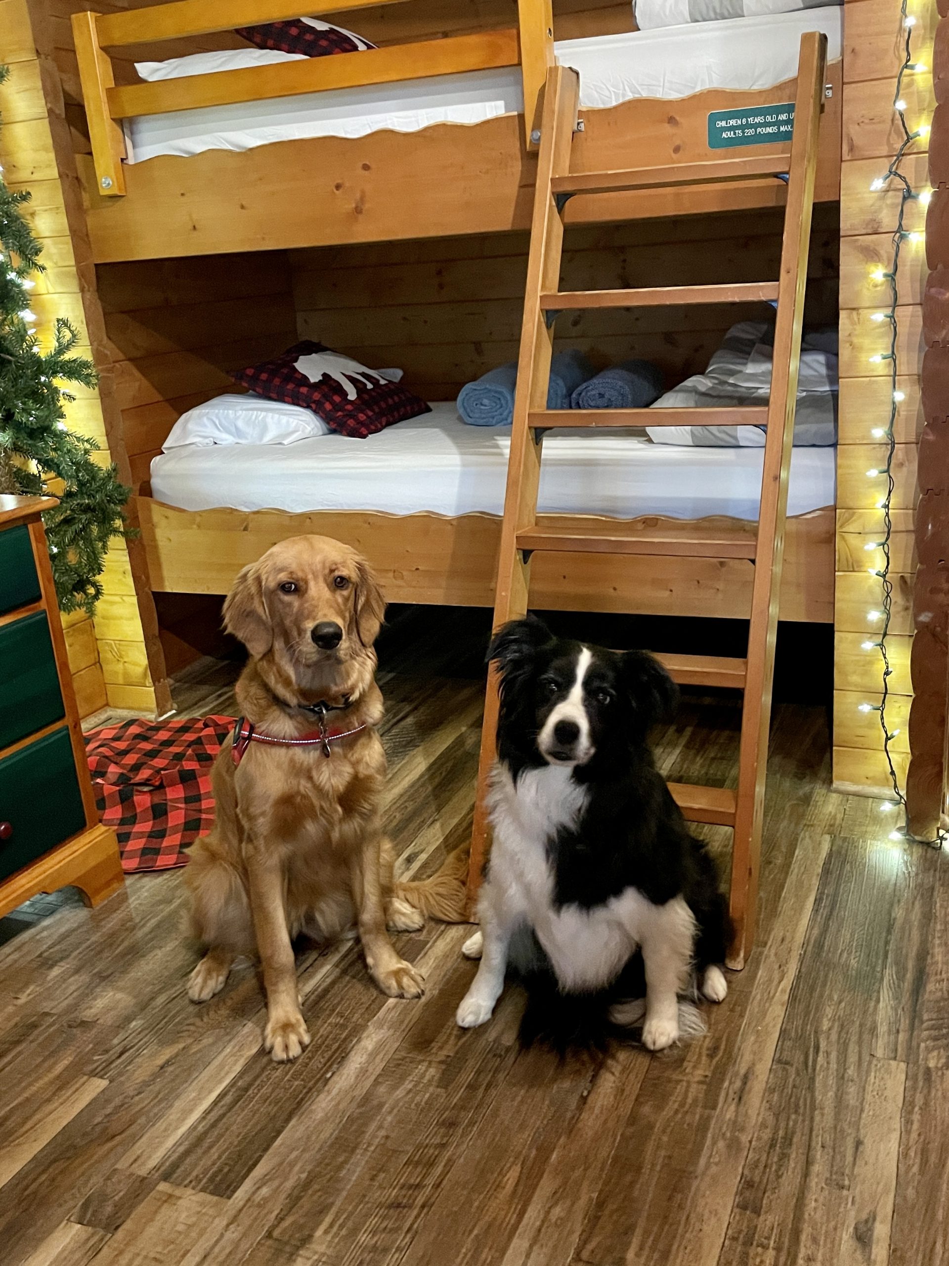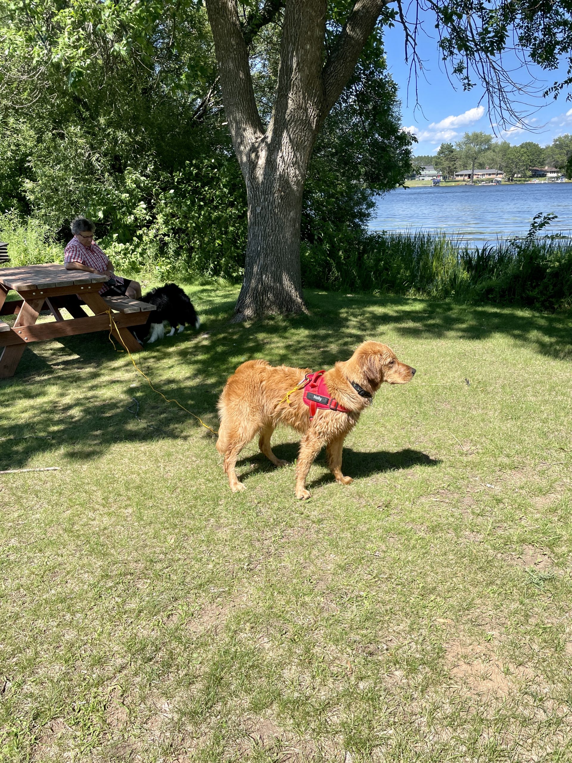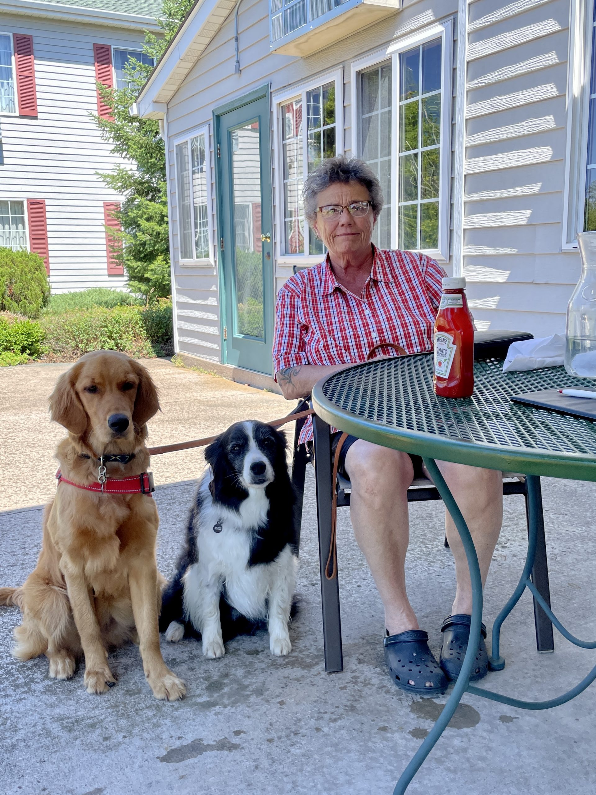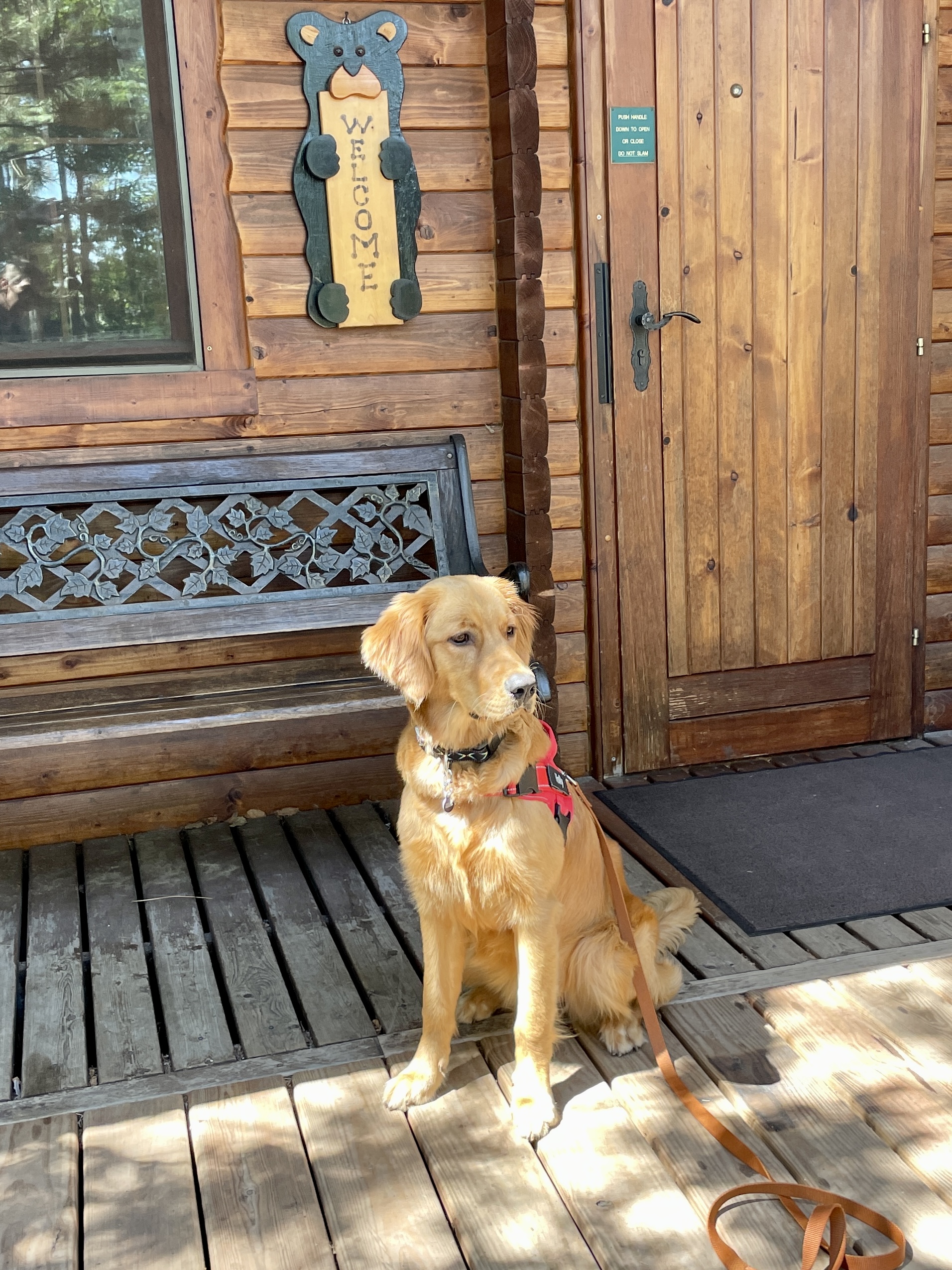 Today I had a milestone birthday and celebrated it with DeeAnn, Rainie and Holly in Hayward, Wisconsin.   Our cabin was an adorable cozy cabin sitting near the edge of a river.  We settled into the cabin quickly and kept cool in the air conditioned unit.  Holly was in her heaven with all the pine cones and sticks but her interest faded with the saturation.  She amazed me with her relative calmess around and within the cabin.  She treated respectfully and as if it was a large dog house.