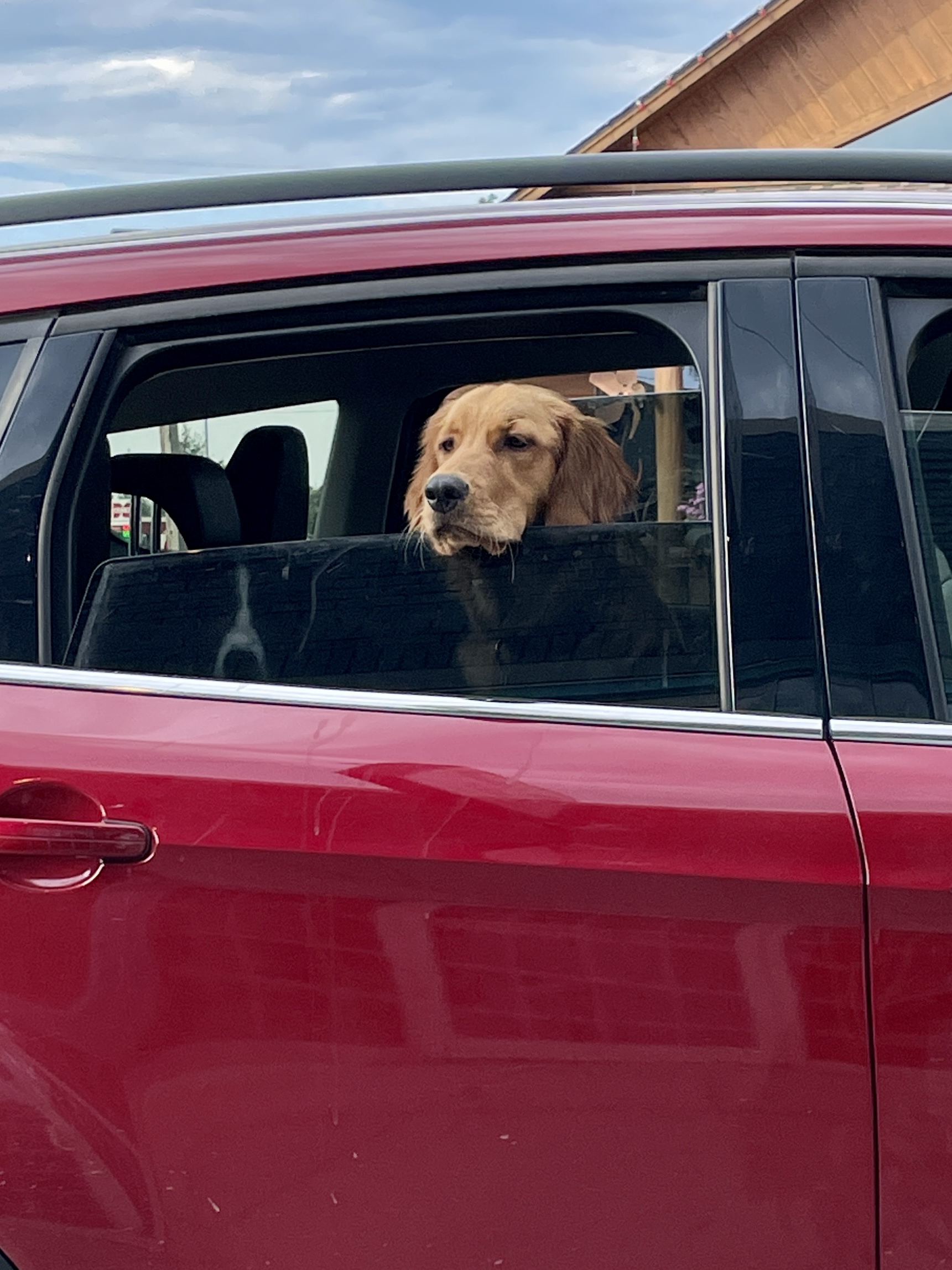 We visited a coffee shop and enjoyed our coffee outside with the car parked nearby, windows down.  Both Rainie & Holly were not shy about making themselves noticeable to coffee shop patrons.  They did very little barking but would stand-up and occasionally place their head out of the window.  It was entertaining to hear the comments from folks, some stopping and asking if they could pet and/or feed them.  The coffee shop owner came out with turkey for each of them creating a new standard of expectations when we went to the ice cream shop!
