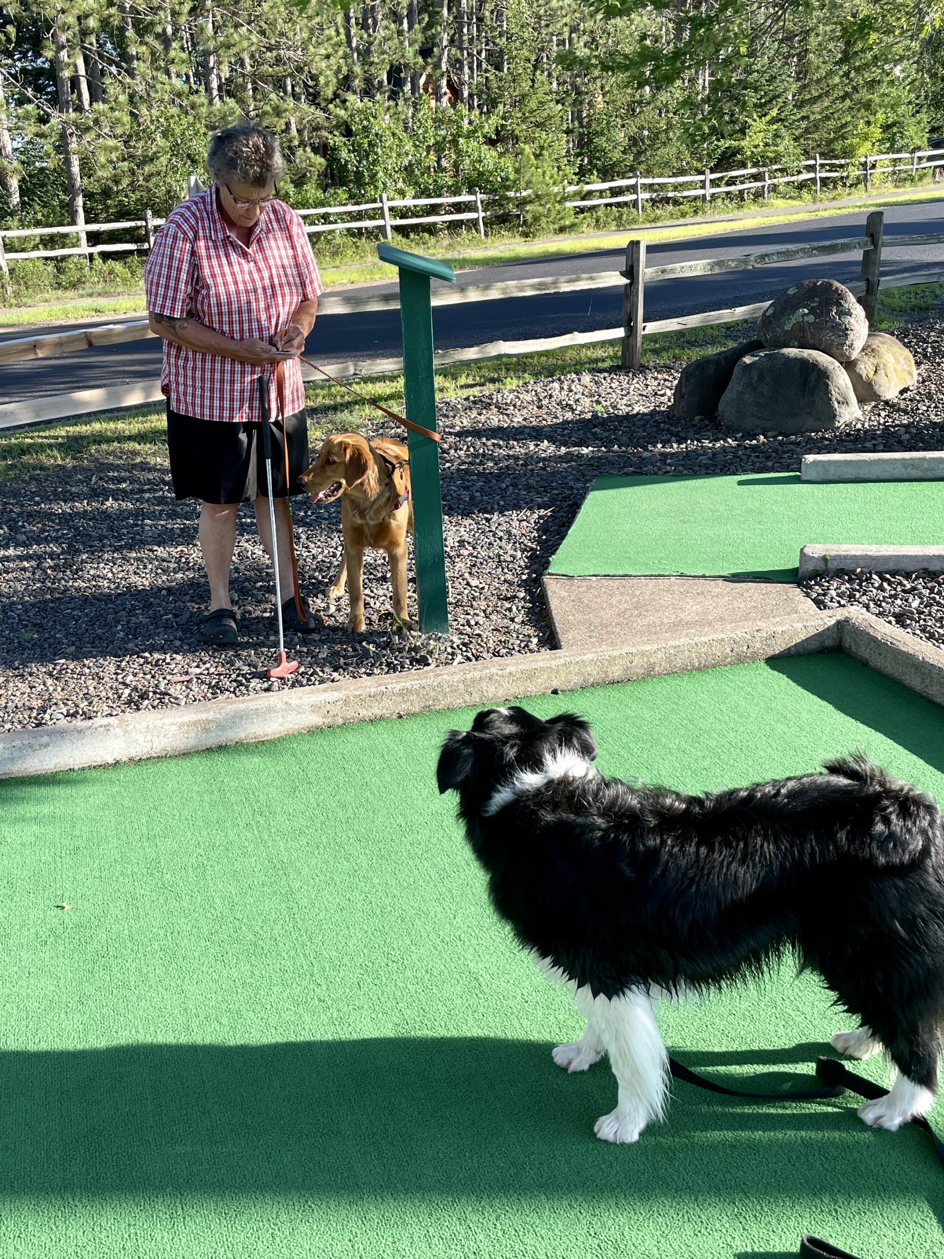 To our liking, Hayward is a dog-friendly town and we took full advantage of it!  Holly and Rainie joined us on the outdoor patio for lunch at the Flat Creek Lodge where we both had an awesome fish sandwich.  Later in the day the dogs joined us on the course for a rousing game of miniature golf.  Holly made it more rousing than we liked at times.  She was determined to chase and catch the golf balls and her determined pulling nearly allowed her to succeed.  At each hole there was a platform & post used by most people as a desk to write down your score.  We used it as a hitching post to wrap my naughty girl’s leash around for added support in holding her back.  Fortunately the course was not busy but we did get a few peoples attention and saw their grins as we fumbled our way through holding Holly back, carrying golf clubs & balls along with a scorecard and small pencil.  Rainie simply followed us around, dragging her leash and finding a shady spot to sit and wait for the commotion to end.