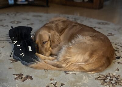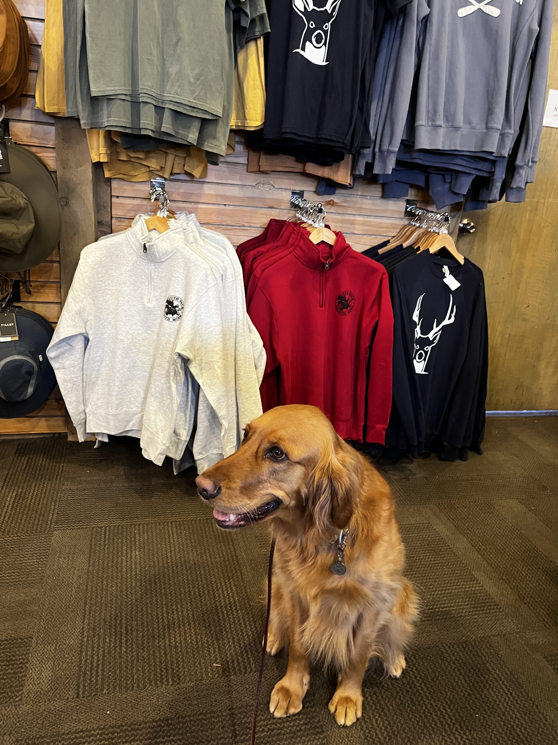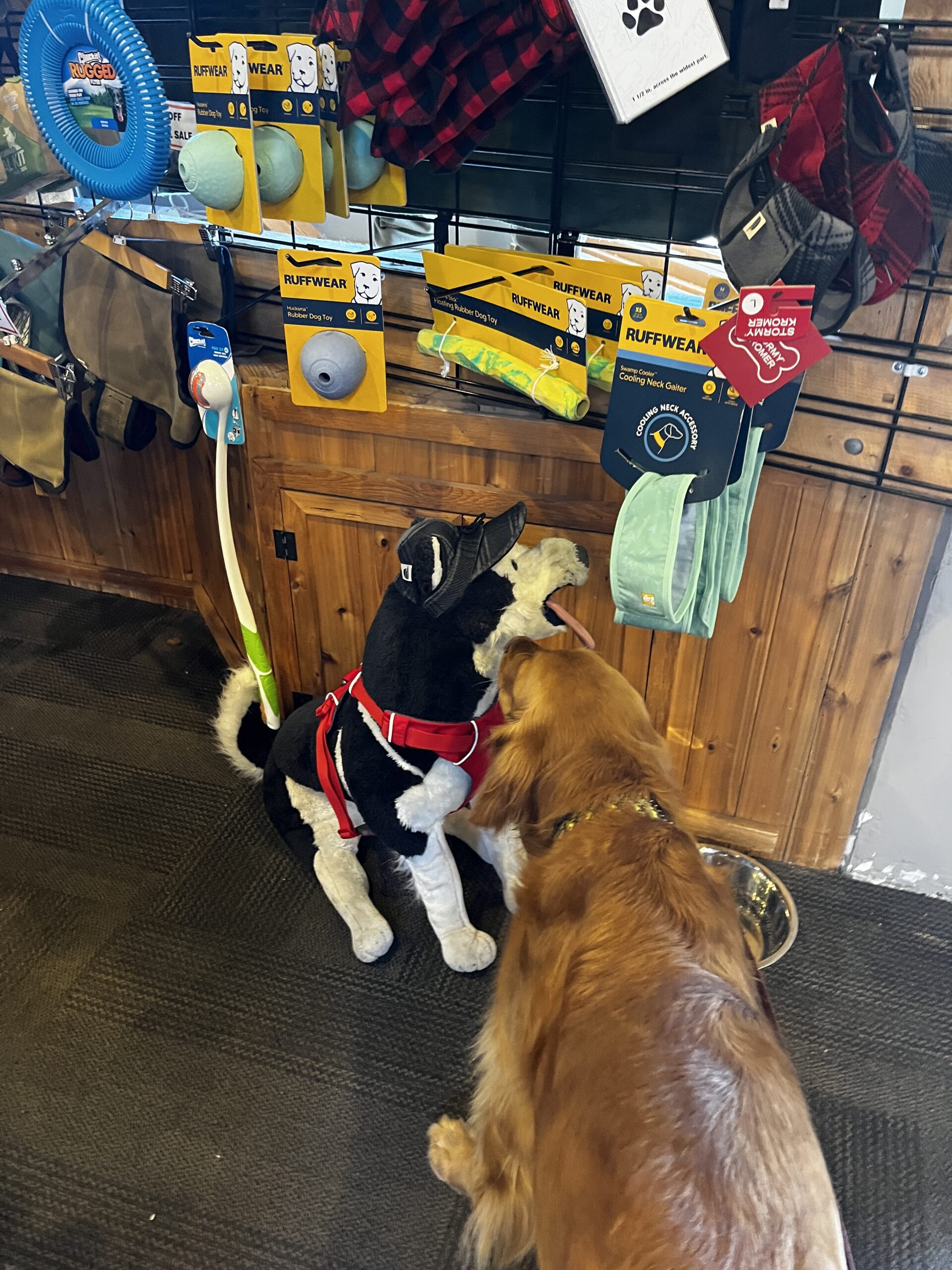 After breakfast, Holly and Helen got back in the party again by each taking a turn going into the Duluth Pack Store. It’s a favorite store of Lanny’s and I found that at 10:00 on a Monday morning in the winter time, the store is a perfect time for me to bring Holly. We were the only shoppers in the store for most of our time there, eventually a few people joined us. Holly thought it was cool to be in a store with carpet and clothing. She stopped by the canoe filled with rolled up camping sacks, eyeing them up to steal. Plan thwarted. She rushed up to a child size mannequin expecting to give, maybe get, some loving but stepped back confused with the non-reactive figure. She stopped in front of the life size mirror and pondered if another dog was in the room, but left quickly and didn’t want to find out. Everytime she came across Mary or Lanny in the aisle, she acted like she hadn’t seen them in eight years.