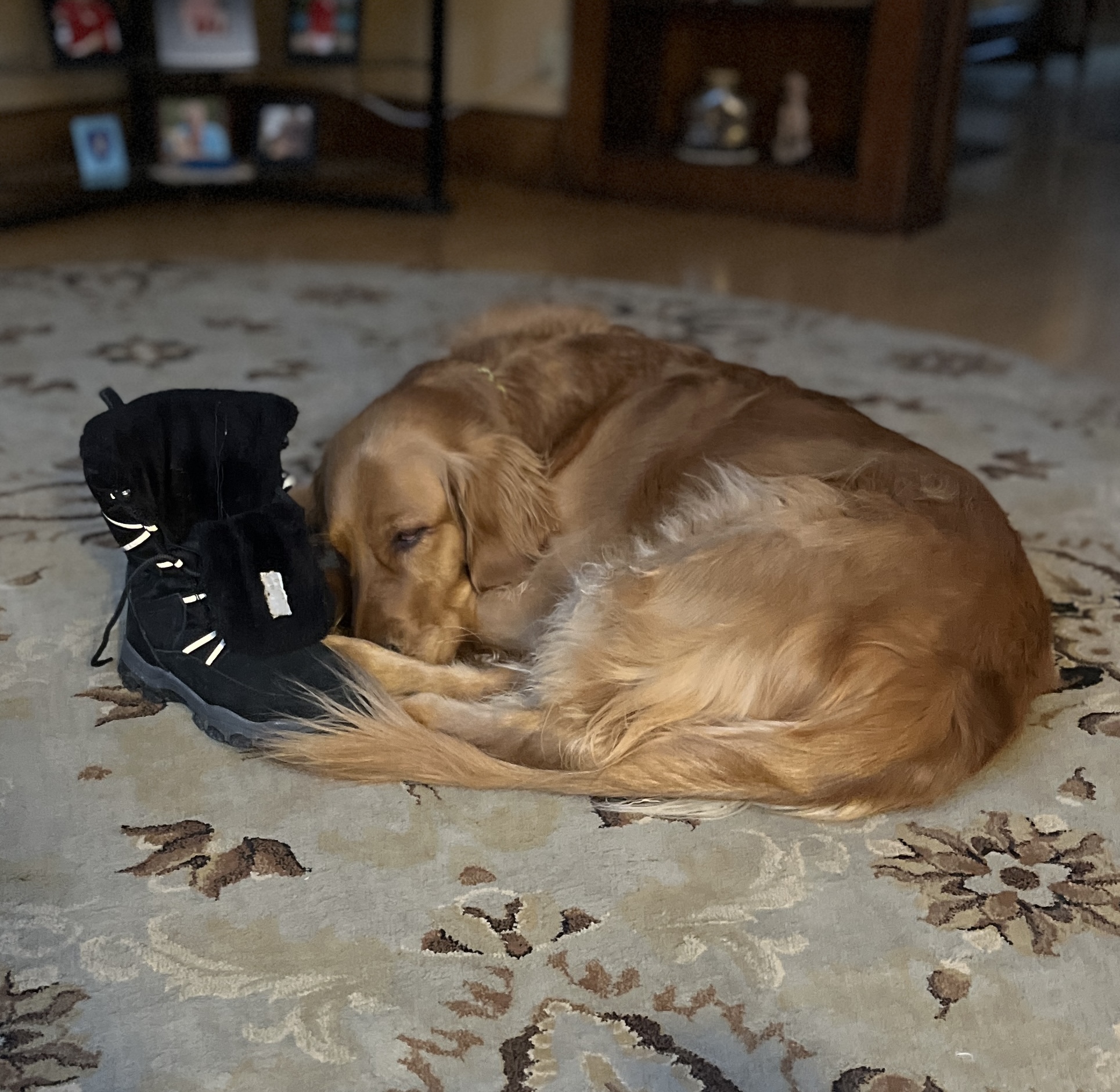 After breakfast, Holly and Helen got back in the party again by each taking a turn going into the Duluth Pack Store. It’s a favorite store of Lanny’s and I found that at 10:00 on a Monday morning in the winter time, the store is a perfect time for me to bring Holly. We were the only shoppers in the store for most of our time there, eventually a few people joined us. Holly thought it was cool to be in a store with carpet and clothing. She stopped by the canoe filled with rolled up camping sacks, eyeing them up to steal. Plan thwarted. She rushed up to a child size mannequin expecting to give, maybe get, some loving but stepped back confused with the non-reactive figure. She stopped in front of the life size mirror and pondered if another dog was in the room, but left quickly and didn’t want to find out. Everytime she came across Mary or Lanny in the aisle, she acted like she hadn’t seen them in eight years.