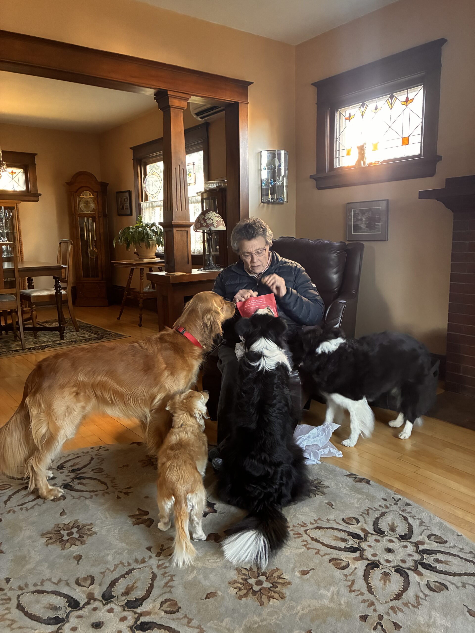 November brings a flurry of furry birthdays and a heavenly one! Our dear friend and Helen’s first mother, Tessie’s birthday was celebrated on November 17 with all the Sven Saw Sisters (and Helen) getting together with Tessie’s sister Susie, niece Katie and great niece Madeline. This is Tess’s second heavenly birthday and our gatherings continue to bring connection and memories. Helen certainly hasn’t forgotten Susie & family, as indicated by her squeal and energized tail wagging.