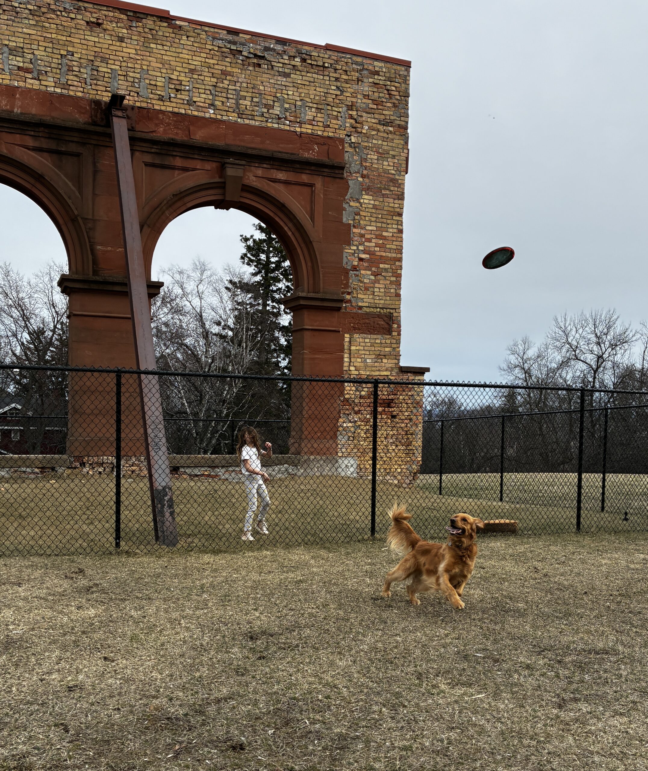 Heartley, her Dad and Milo (dog) found Holly, Helen and I at Old Main Park. Holly was fetching the frisbee. Helen sniffing the grounds. When Heartley recognized it was us she ditched her Dad and dog to come running over to us. This time Helen wasn’t the main draw, but Holly and her frisbee. Heartley releaved me of my frisbee tossing duties much to Holly’s delight. Apparently my tosses have gotten boring. At one time a very large building sat on the Old Main Park grounds. It was the original UMD building. A fire destroyed the main structure about 25 years ago. The main arches into the building were saved and stand tall at each side of the flattened ground where the building stood. The arches have recently been enclosed with fences, signage with falling rock warnings. Many people are disappointed in the new safety precaution as it has ruined the beautiful background of photo ops. Proms, weddings, reunions, etc all had been captured with the beautiful backdrop of the giant rock arches. Including a chain link fence changes the whole mood of the photo. Chain link fences also have a way of swallowing stray frisbees that get caught in swirling winds. When one of the frisbee tosses landed on the wrong side of the fence for Heartley, I hollered out reassurance to her that Holly has many more frisbees, all is well. Silly me. She looked back to me and said – ‘I can get it. I know how to get in.’ Off she went to the opposite side, out of sight from her Dad and I, then appearing inside the fence where she picked up the frisbee and tossed it back out to Holly. Then she disappears out of sight and returns to the park side to continue her play time with Holly. I told her thank you, followed by a you’re welcome. That was the end of it. After they left, I circled the gated archway looking for an opening. Nothing. Tight as jail cell. I have no idea how Heartley got in and out of there so easily and quickly. I can’t even say I aided in this crime and there was no acting clueless this time, I am totally clueless. It makes me smile though, thinking of these two bright, energetic and innocent young girls. They respect rules but when the situation warrants they find way to bend and amend. They have a good handle on life already.