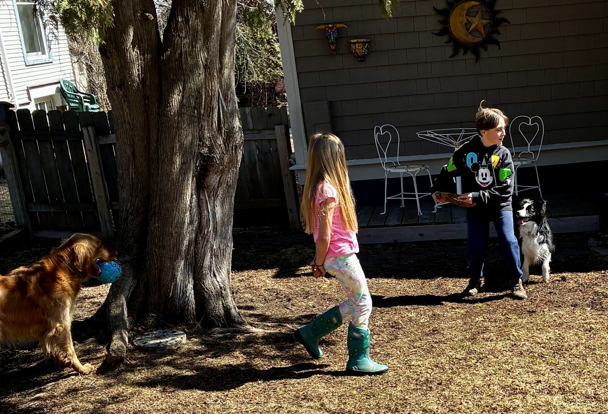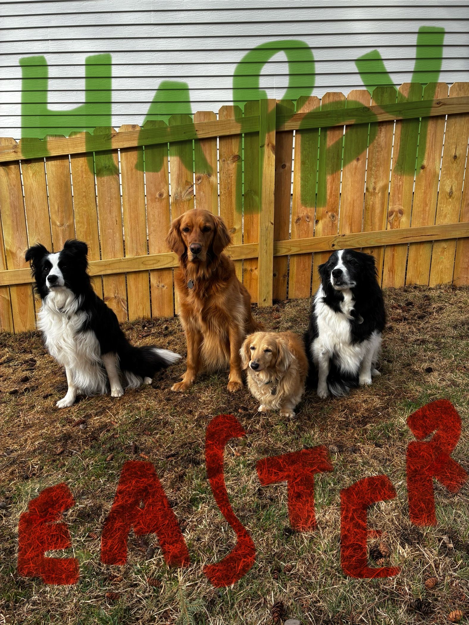Easter week-end brought out neighbors and neighbors grandchildren. I had Keltie and Rainie also. As is often the case, a yard filled with dogs serves as a kid-magnet. Donna’s grandsons, Dane and Cole, came into the yard to play with the dogs which of course had Holly jumping over the moon. Literally. Once settled down, Dane and her played fetch intermixed with chase. Cole & Dane played a game of keep away with Holly, tossing the frisbee to and from each other. Holly’s speed would thwart the game especially during any poor throws or dropped tosses. Then the game became chase, Holly’s head held high with a smile taking over her face while she held the frisbee. Heartley stopped by as well, once again migrating to Helen. Those two sat safely tucked away on the adirondack chair. Later that afternoon, Ivy came running over to the fenceline. They had just returned from church so she was wearing her new Easter outfit with a darling white dress coat keeping her warm. Seeing her put a surge of adrenaline into all the dogs. Their barking and jumping on the fence were both out of control. Once calmness finally began settling in, I noticed Ivy had a muddy pawprint on the bottom left corner of her beautiful white coat. I saw her looking back towards their house and I knew she was concerned on how to explain the mud on her white coat. I was concerned too. I offered her a damp rag which she quickly accepted, always standing with her back to their house. She worked on her coat for about 10 minutes, even using a Tide cleaning pen on it. She was finally satisfied with how it looked and stated her plan – ‘I’ll just keep my hand over it’. I felt bad that the dogs had caused her such stress. I wondered if I should go explain the crime to her parents, yet a part of me also wanted to help pull off the cover-up she had going. I told her if her mother says something to have her call me, her grandma has my number. I didn’t hear anything more about it. Today, all of them (John, Donna, & Diane) walked over to the fenceline to throw the ball for Holly and chat with me. I confessed about my aiding and abetting a crime of covering up muddy pawprints from a darling white Easter coat. They laughed, not knowing anything about it. I filled with pride inside thinking that Ivy may have pulled it off! Both Donna & Diane were elementary teachers, both have awards and high honors for their outstanding and dedicated work. Diane made comment – ‘it’s the kids that don’t get dirty that I get concerned about.’ I hope Ivy had the same sort of relief as I did. I apologized again and said it is probably the parents I should be talking with not grandparents, which brought a flinging motion with her hand and the comment ‘Don’t worry. We’ll take care of them.’ Now I know why all their grandkids absolutely love coming to their house to visit! And why I adore them as neighbors. That said, this spring has proven it is time to again attempt a training plan with Holly discouraging her from jumping on people, fences or doors. After all, she is three years old.