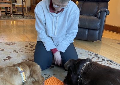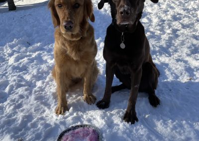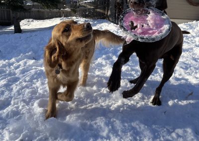 Holly & Kooper scored tonight with each getting a corner to lick on the peanut butter board and each getting turns at playing a game of volleyball with me (using a small nerf soccer ball!) Three consecutive volleys was our record. No need to worry about the ball getting too far away, they both are on it, literally. The ball would be brought directly back to me, dropped in my lap with them sitting at attention ready for another chance to bop the ball into the air – eyes focussed intently on the ball.