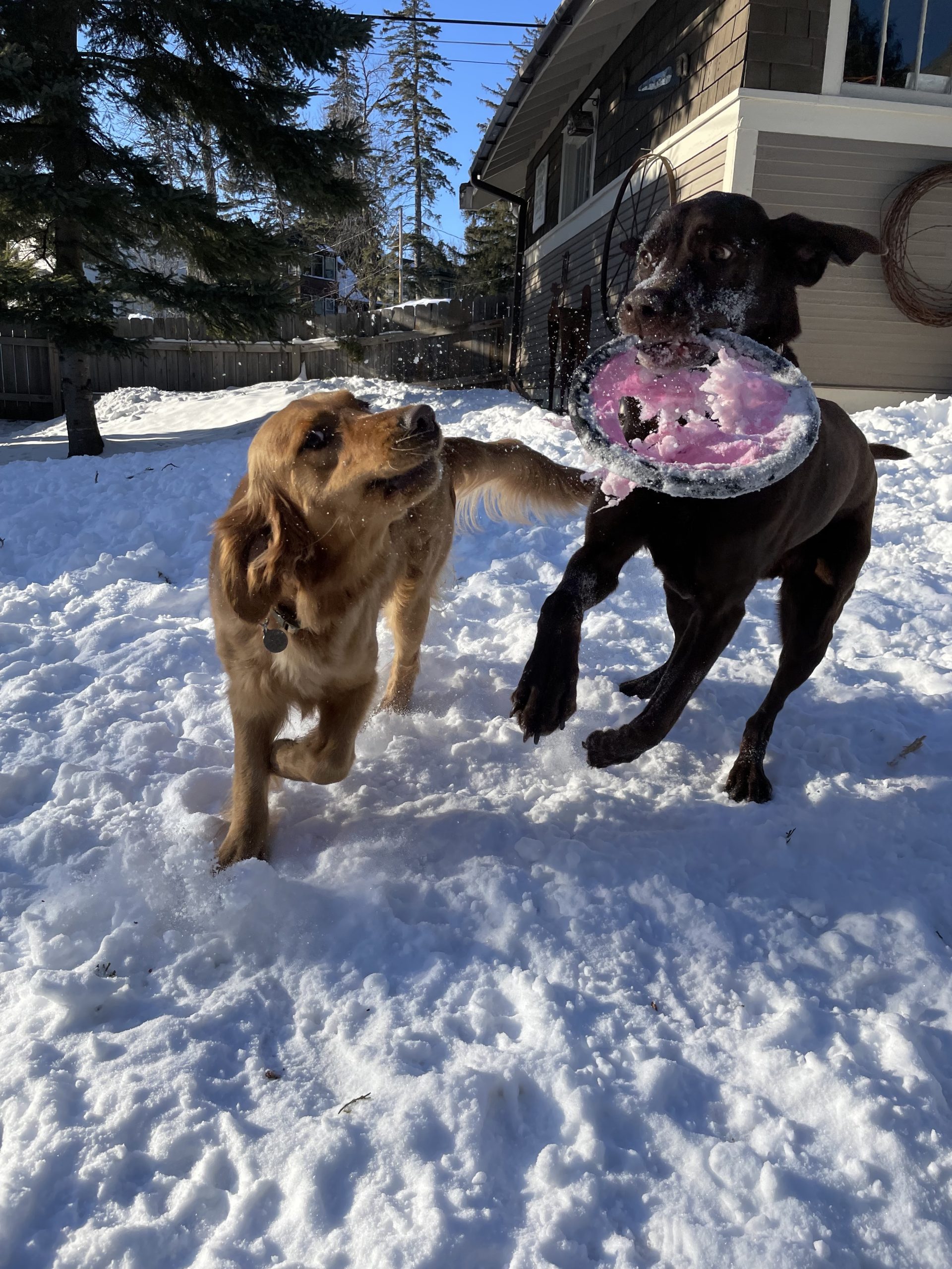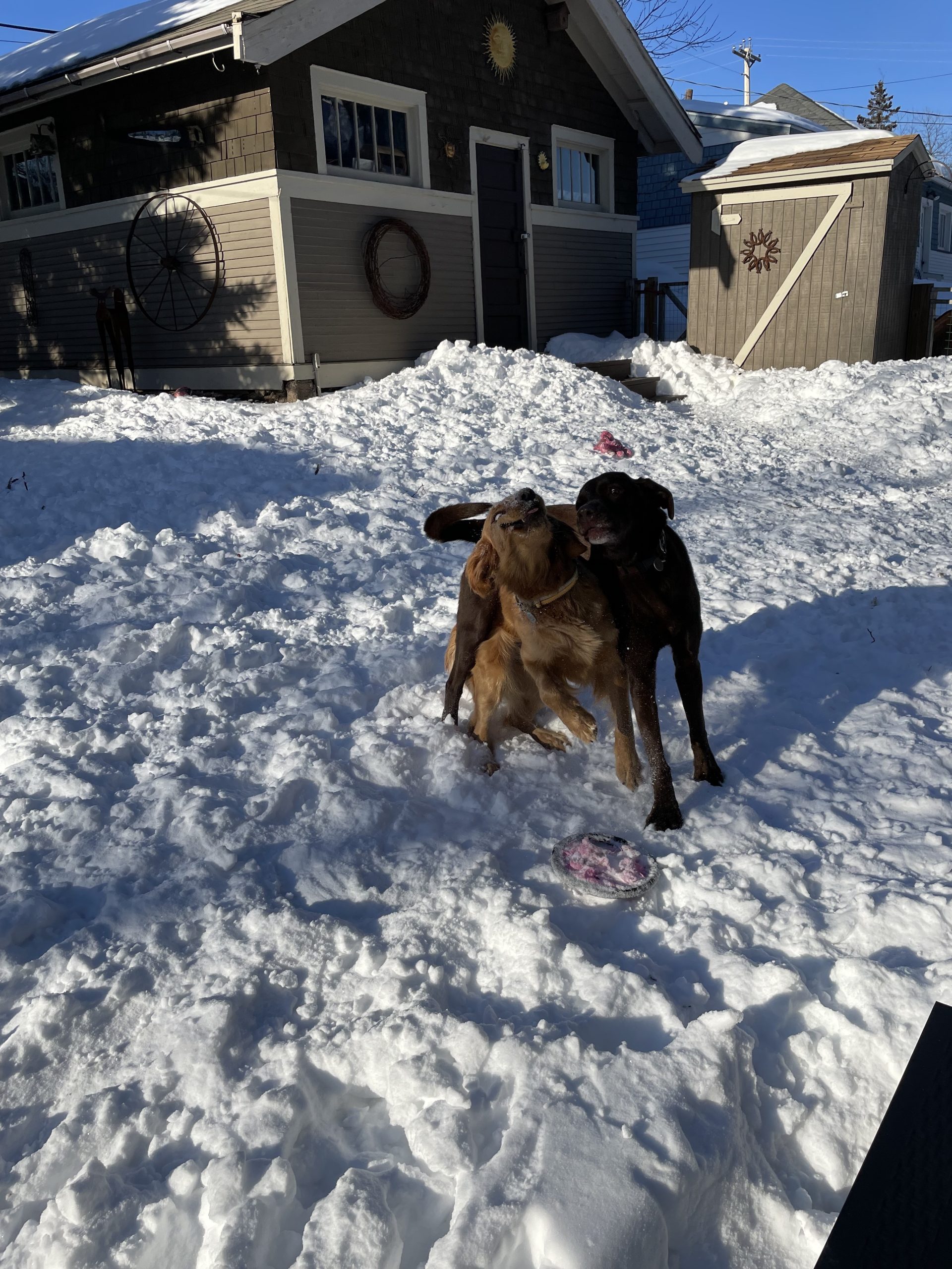 Holly & Kooper scored tonight with each getting a corner to lick on the peanut butter board and each getting turns at playing a game of volleyball with me (using a small nerf soccer ball!) Three consecutive volleys was our record. No need to worry about the ball getting too far away, they both are on it, literally. The ball would be brought directly back to me, dropped in my lap with them sitting at attention ready for another chance to bop the ball into the air – eyes focussed intently on the ball.