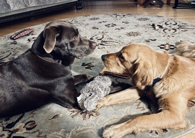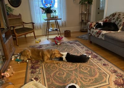 Holly had Kooper’s company Friday & Saturday before entertatining Keltie Saturday night & Sunday.  Kooper & Keltie have become her  K Pups and she is rich with friendships!  For awhile, Kooper and Holly shared the bed, nestling in nose to nose, fully content after their play time – which is at a different level and intensity than that of Keltie and Holly.  I love that she makes the adjustments when playing with the different dogs, as well as people.  She learns their likes, dislikes, strengths and capabilities, then amends the play accordingly.  With Kooper, she will snatch a toy and dart away enticing a game of chase; with Keltie she will lay down and nudge a toy in her direction enticing her to grab the end for a gentle game of tug.
