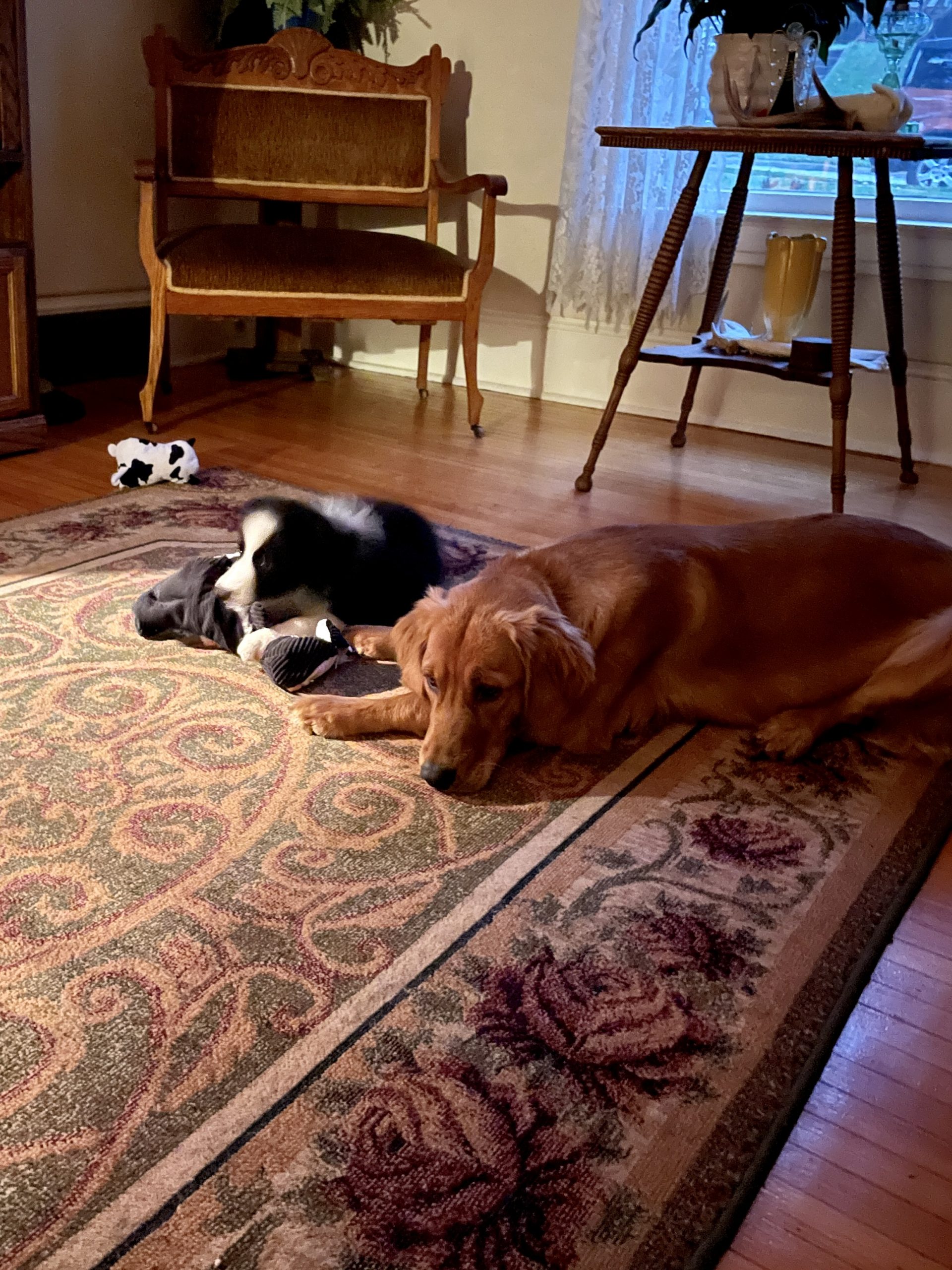 It’s been a busy weekend celebrating DeeAnn’s birthday – little Keltie’s first birthday party and first sleepover with Holly.  At one point, I harbored concern about Holly’s ability to be gentle with a little 10-12 pound puppy.  Seems I am often telling her to be gentle, settle down, “no chase” and “easy” with Rainie and Gracie.  When she is with Keltie there is far less of those phrases and much more praise and “good girl” wishes.  It has been heartwarming to watch how Holly has embraced Keltie and plays (and plays and plays) with her as if she is with a littermate just 9 months ago.  They never seem to tire but periodically we see short power naps from both of them.  DeeAnn and I watched a movie in the evening and had to enforce a ‘no play’ period so we could watch with less chaos in the room.  Much like Kooper allowed Holly to take toys from his mouth, Holly allows Keltie to take toys from her mouth. Keltie takes running leaps to land on Holly’s head and they twist and turn until both get upright again.  Occasionally we here their teeth clicking together as they mouth wrestle, Holly trying to avoid getting nipped by the laser sharp puppy teeth.  It’s nonstop loving puppies doing puppy play.