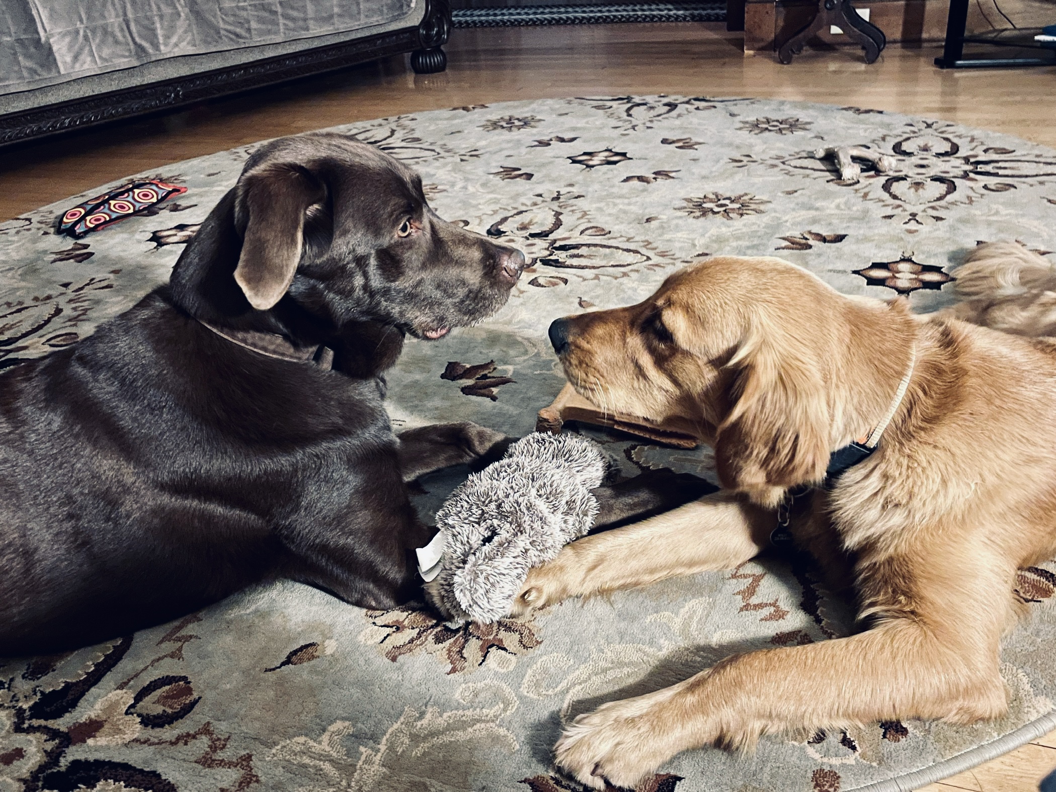 Holly had Kooper’s company Friday & Saturday before entertatining Keltie Saturday night & Sunday.  Kooper & Keltie have become her  K Pups and she is rich with friendships!  For awhile, Kooper and Holly shared the bed, nestling in nose to nose, fully content after their play time – which is at a different level and intensity than that of Keltie and Holly.  I love that she makes the adjustments when playing with the different dogs, as well as people.  She learns their likes, dislikes, strengths and capabilities, then amends the play accordingly.  With Kooper, she will snatch a toy and dart away enticing a game of chase; with Keltie she will lay down and nudge a toy in her direction enticing her to grab the end for a gentle game of tug.