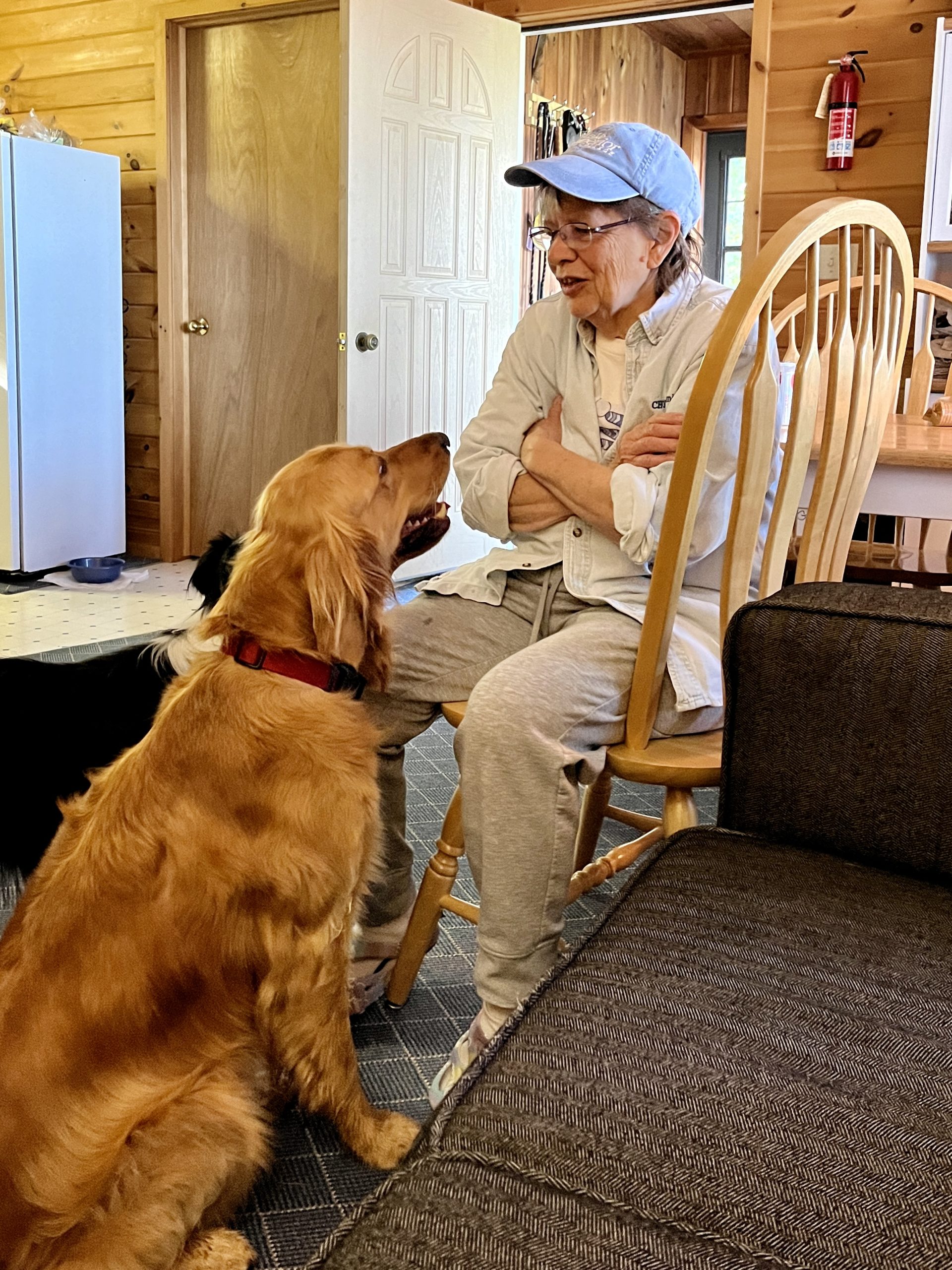 Holly was in her heaven while in Ely.  Lakes and large open grass fields all in one setting had her floating on air.  After all the outdoor fun, she was a tired, content girl inside.  I enjoyed watching her socialize with everyone.  She made the rounds and managed to convince each person that she was in need of a neck/chest rub and worthy of being told she was a good girl, maybe even deserving of a treat or two.  I called it schmoozing!  She does it well.
