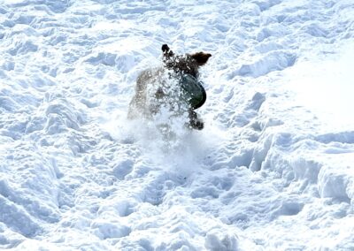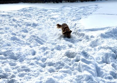 DeeAnn and I took a short road trip to Ashland, Wisconsin – I had a silent auction certificate that was expiring in March. The dogs (minus Helen) and us had a quaint suite overlooking the cold lake. Helen had a sleepover with Georgette & Tom, sparing her from feeling need to bark at every shutting door and muffled voice in the hotel hallway. Holly doesn’t have much experience with overnights at hotel rooms. She wanders and sniffs, waiting for the next car ride to occur. Walking the hallway had me on eggshells after Holly saw a little girl by a door and about took both of us into the room to greet her. Fortunately, Rainie and Keltie were good role models for her, if they settled in she knew she should too. The cold temperatures shortened the dogs outdoor play time. We did find a large parking lot and open field on the outskirts of town. We couldn’t tell what type of business it was, if it even was one any more. It sure served the purpose for exercising the dogs – fresh pure snow, open field and well off the main road. When we were done, the smooth glistening snowflakes were a chaotic mess. Hopefully anyone coming to work the following day looked out their window and envisioned dogs having some fantastic frisbee fun, making the massacre something to smile about.