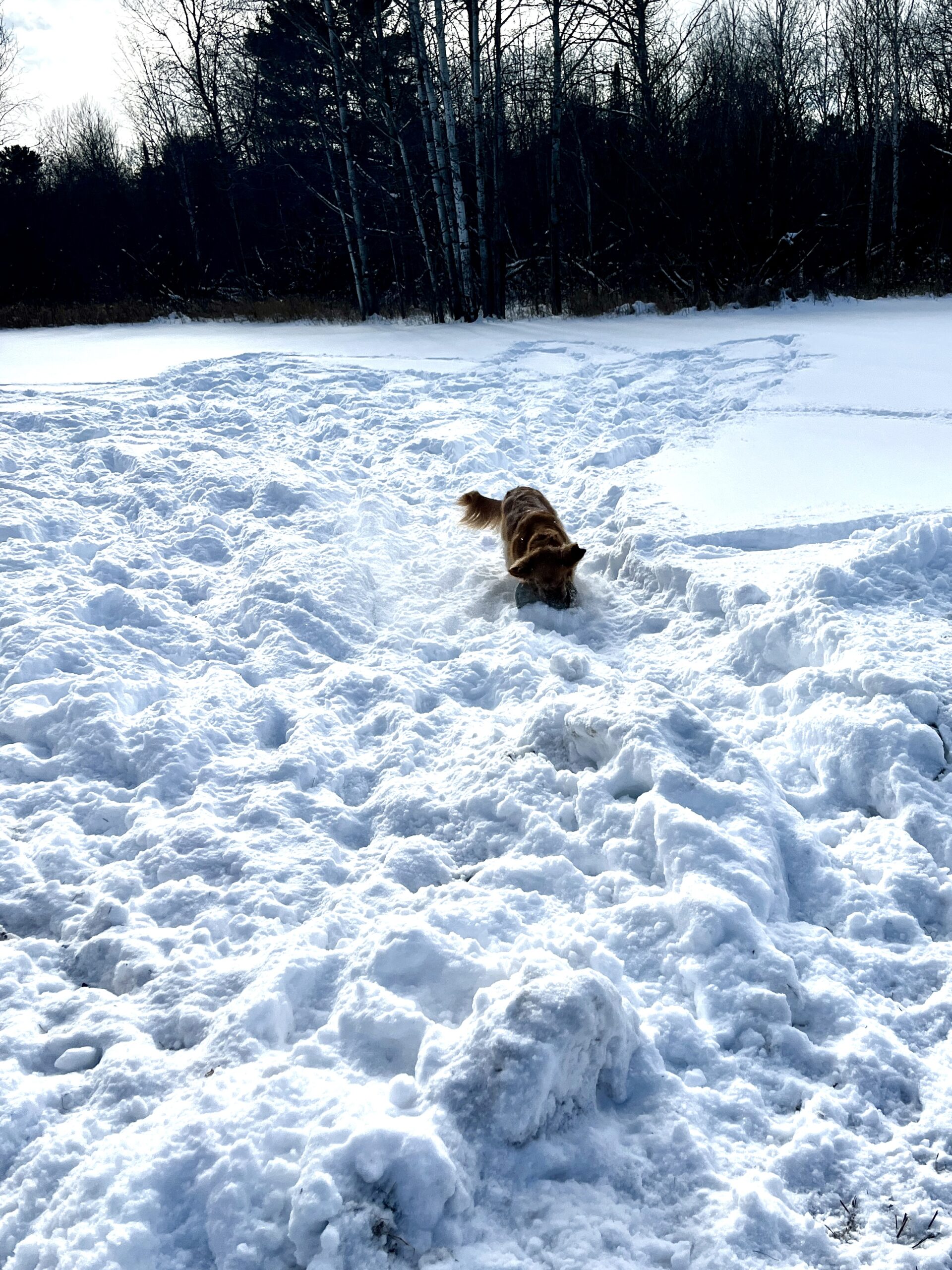 DeeAnn and I took a short road trip to Ashland, Wisconsin – I had a silent auction certificate that was expiring in March. The dogs (minus Helen) and us had a quaint suite overlooking the cold lake. Helen had a sleepover with Georgette & Tom, sparing her from feeling need to bark at every shutting door and muffled voice in the hotel hallway. Holly doesn’t have much experience with overnights at hotel rooms. She wanders and sniffs, waiting for the next car ride to occur. Walking the hallway had me on eggshells after Holly saw a little girl by a door and about took both of us into the room to greet her. Fortunately, Rainie and Keltie were good role models for her, if they settled in she knew she should too. The cold temperatures shortened the dogs outdoor play time. We did find a large parking lot and open field on the outskirts of town. We couldn’t tell what type of business it was, if it even was one any more. It sure served the purpose for exercising the dogs – fresh pure snow, open field and well off the main road. When we were done, the smooth glistening snowflakes were a chaotic mess. Hopefully anyone coming to work the following day looked out their window and envisioned dogs having some fantastic frisbee fun, making the massacre something to smile about.