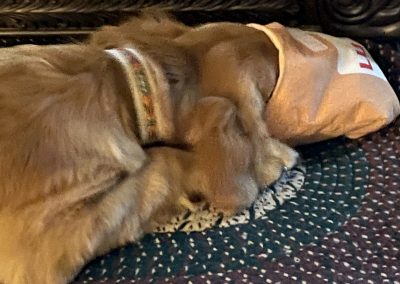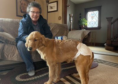 Holly’s diapers came. DeeAnn was here when the delivery was made. We couldn’t resist. The size is worrisome. These will work if she doesn’t grow too much before she goes into heat. There’s a good chance these will be too small. Holly was not excited about the new wardrobe. It’s going to be a challenge to keep them on her, plus get them on/off her for each of her pottybreaks. To be continued.