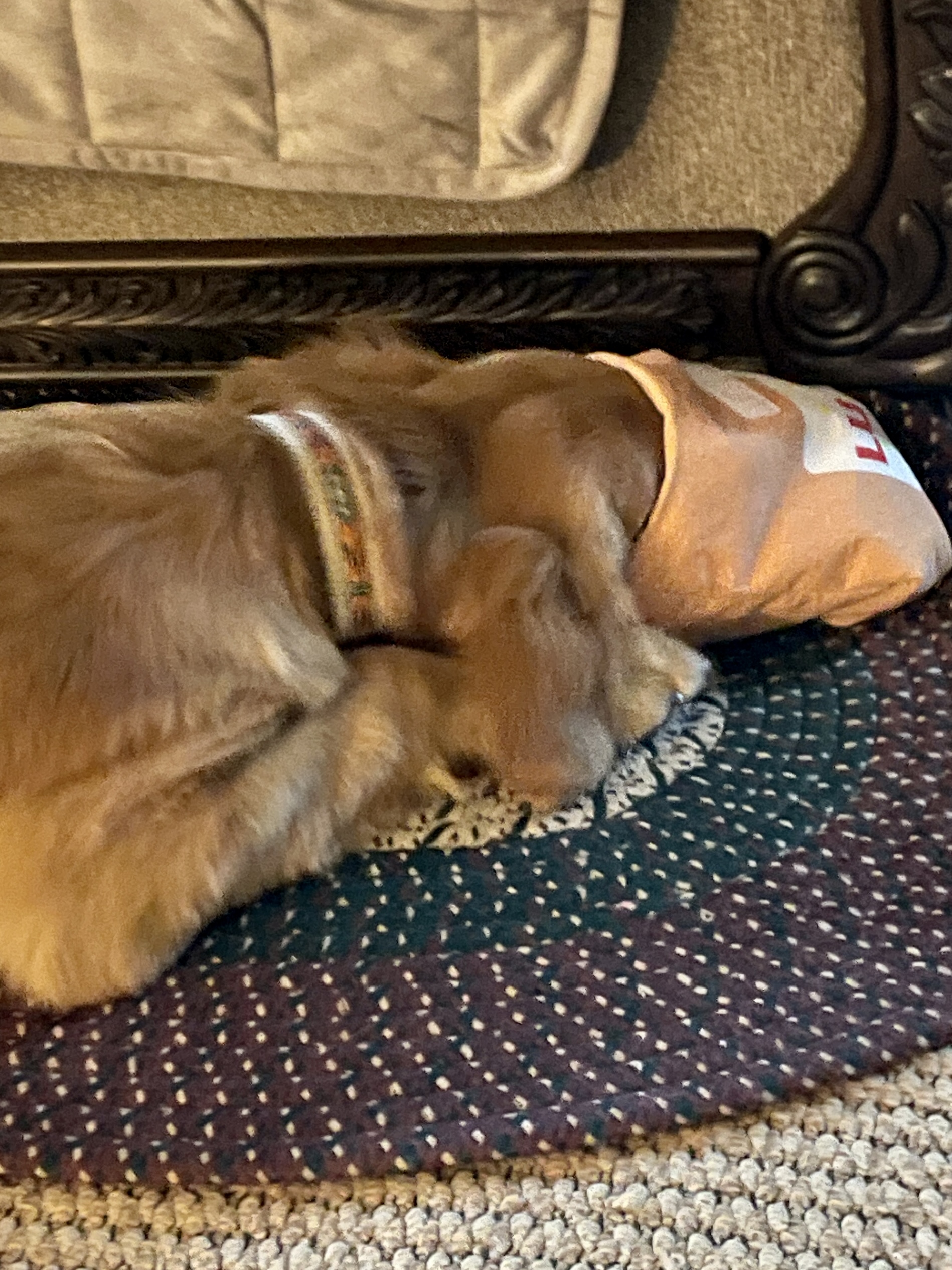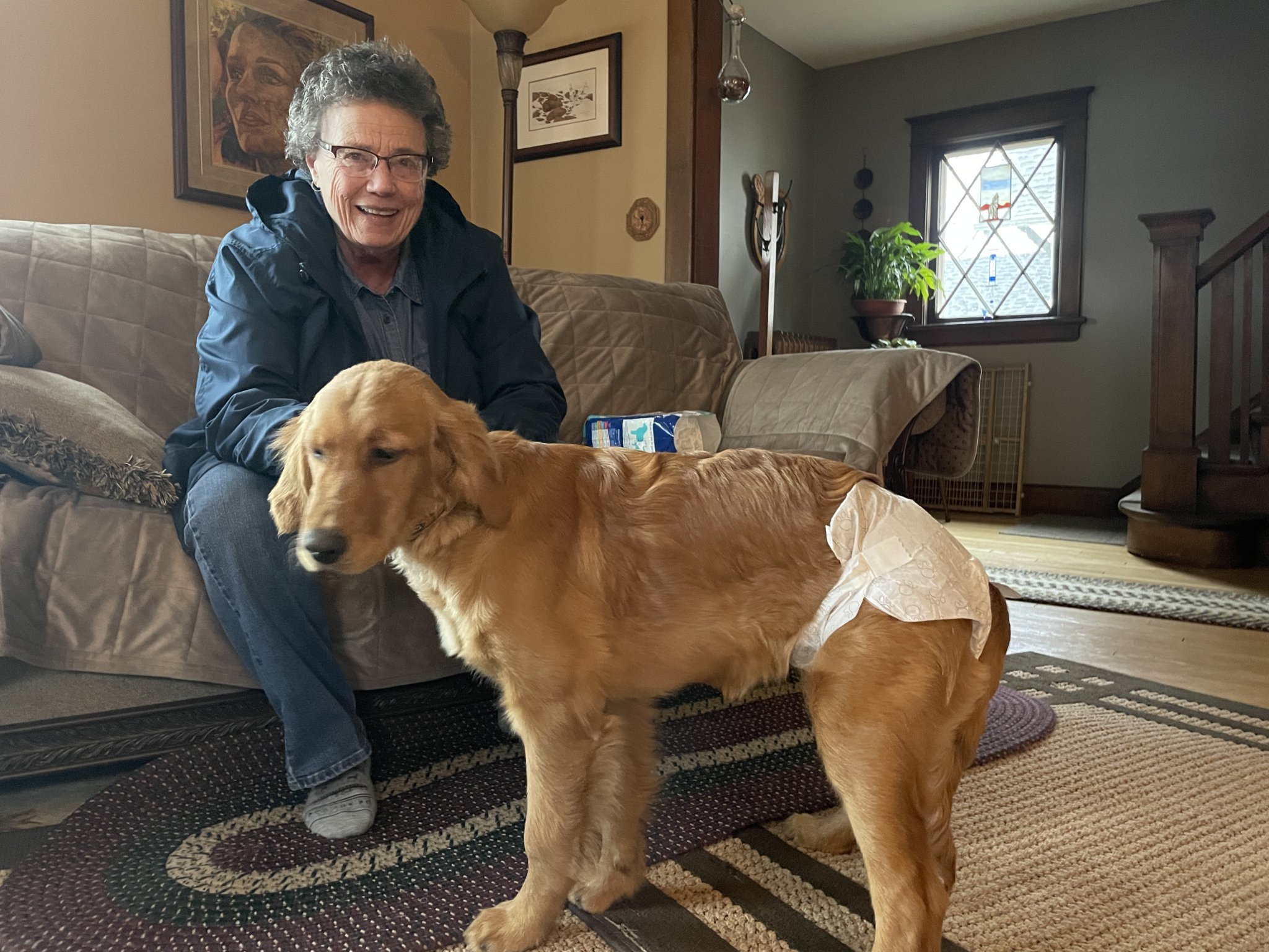 Holly’s diapers came. DeeAnn was here when the delivery was made. We couldn’t resist. The size is worrisome. These will work if she doesn’t grow too much before she goes into heat. There’s a good chance these will be too small. Holly was not excited about the new wardrobe. It’s going to be a challenge to keep them on her, plus get them on/off her for each of her pottybreaks. To be continued.