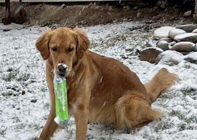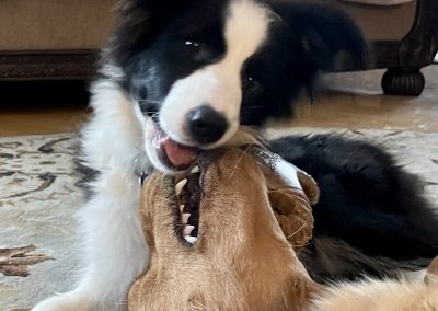 During Rainie’s birthday visit this evening, Holly had some outside time with Finn, a goldendoodle that DeeAnn was pet-sitting. Holly met her match with the tussle and tumble play she likes to do! After a half hour of play, DeeAnn swapped Finn with Keltie allowing Holly a reprieve from the body wrestling but instead now engaged in the game of dart and chase. Holly once again was in playground heaven.
