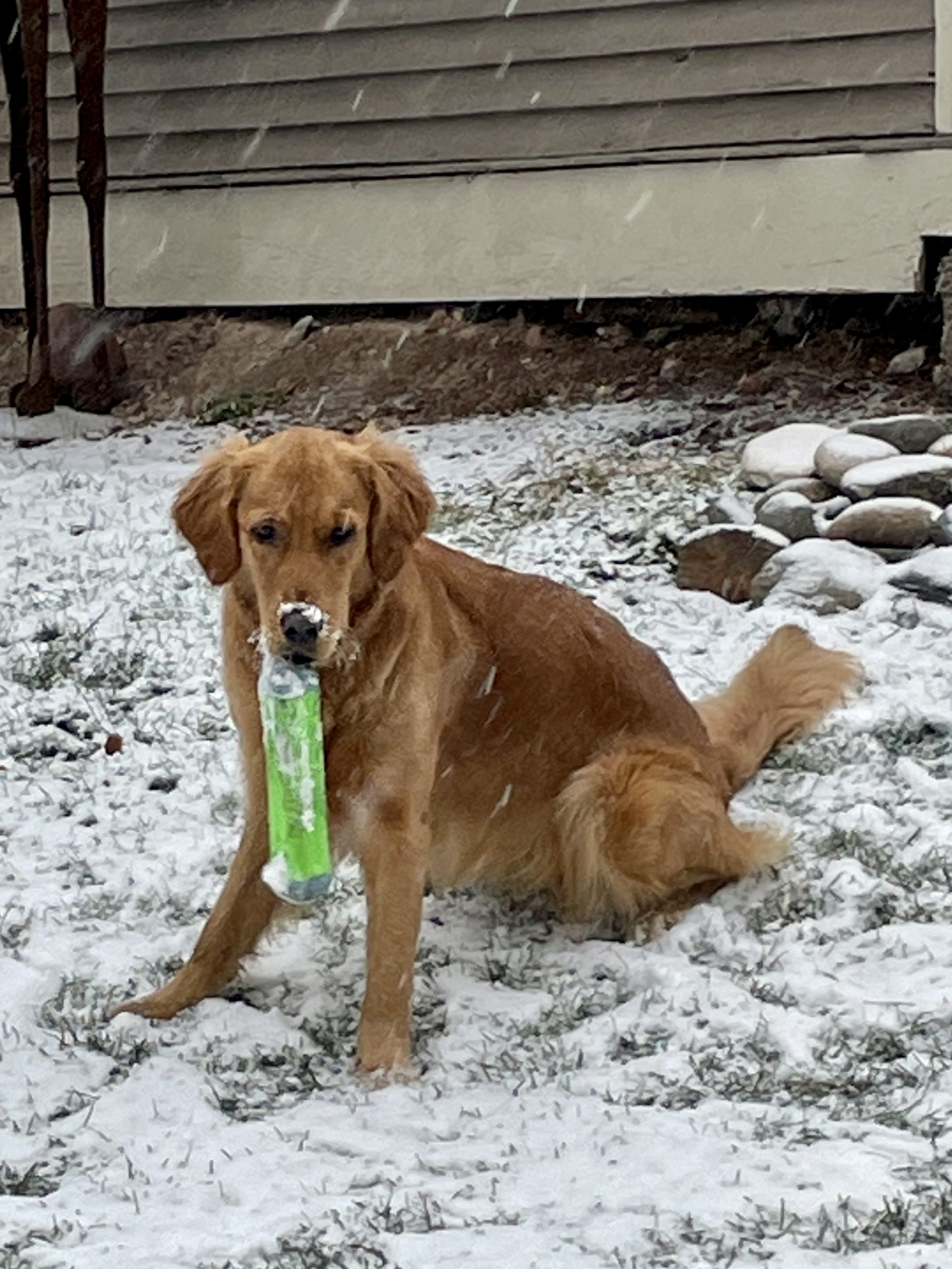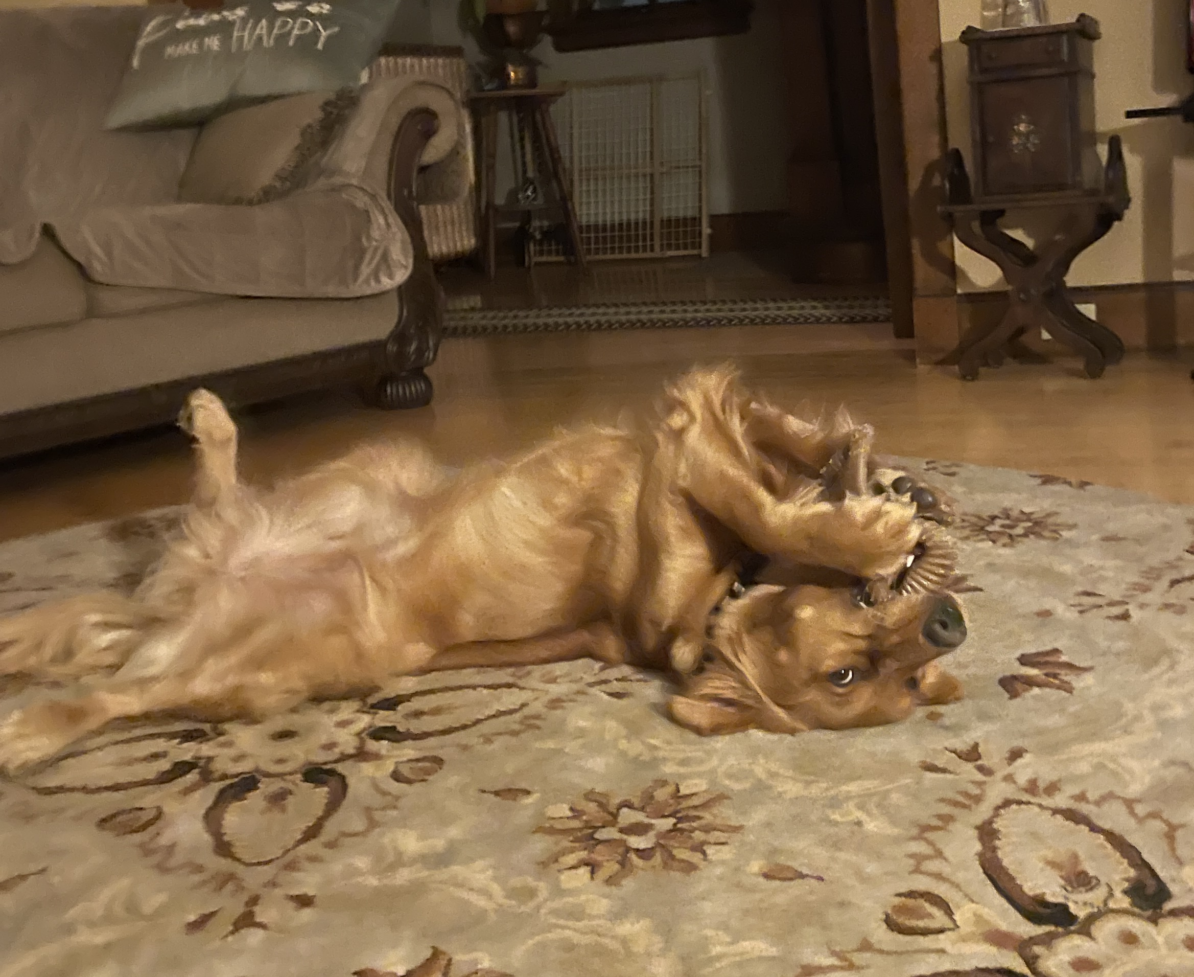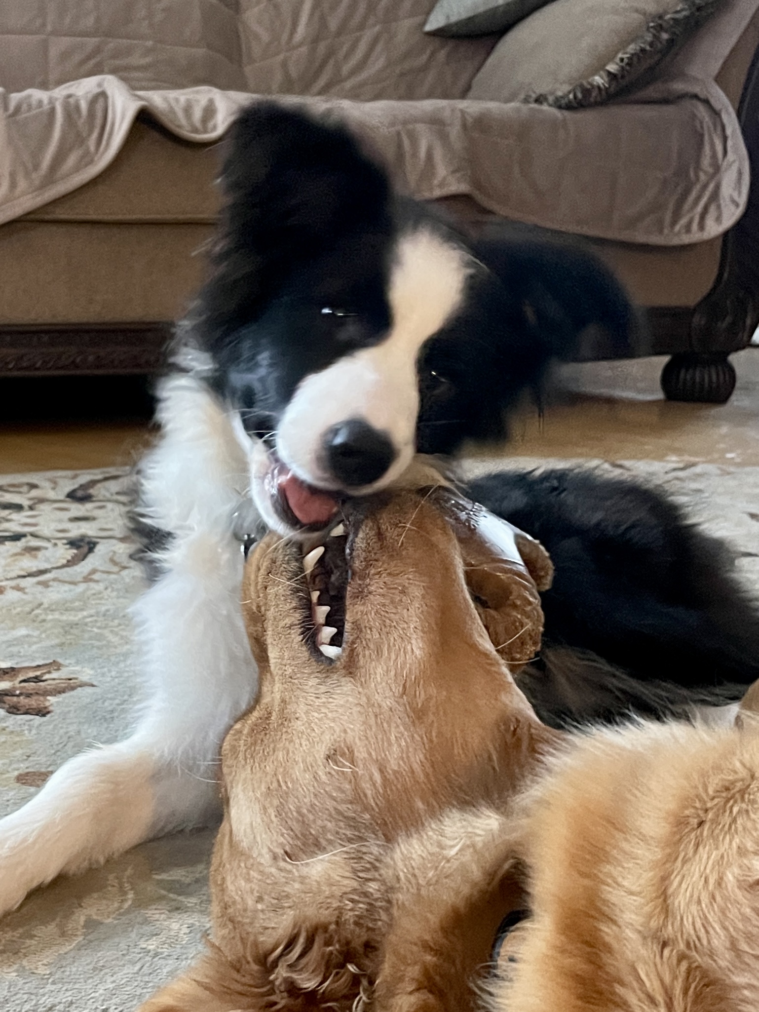 During Rainie’s birthday visit this evening, Holly had some outside time with Finn, a goldendoodle that DeeAnn was pet-sitting. Holly met her match with the tussle and tumble play she likes to do! After a half hour of play, DeeAnn swapped Finn with Keltie allowing Holly a reprieve from the body wrestling but instead now engaged in the game of dart and chase. Holly once again was in playground heaven.
