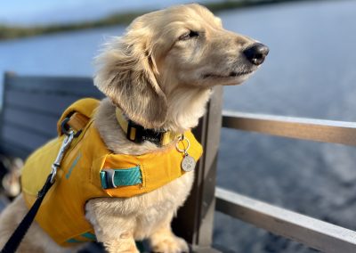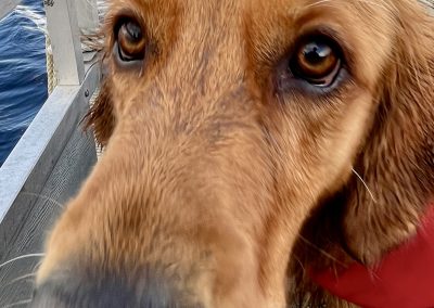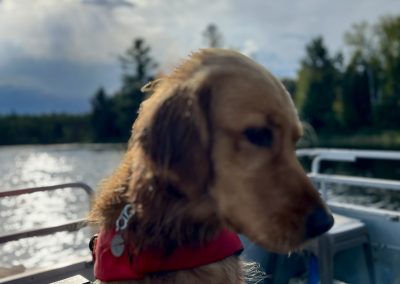 The weather has been beautiful and now that ‘the move’ is over, we all were able to have a peaceful day at the cabin. Taking the pontoon out for a long ride and casting a line from the dock were highlights for both us and the dogs. Bobber duty was taken seriously by all dogs except Helen, who was most concerned about swimming!