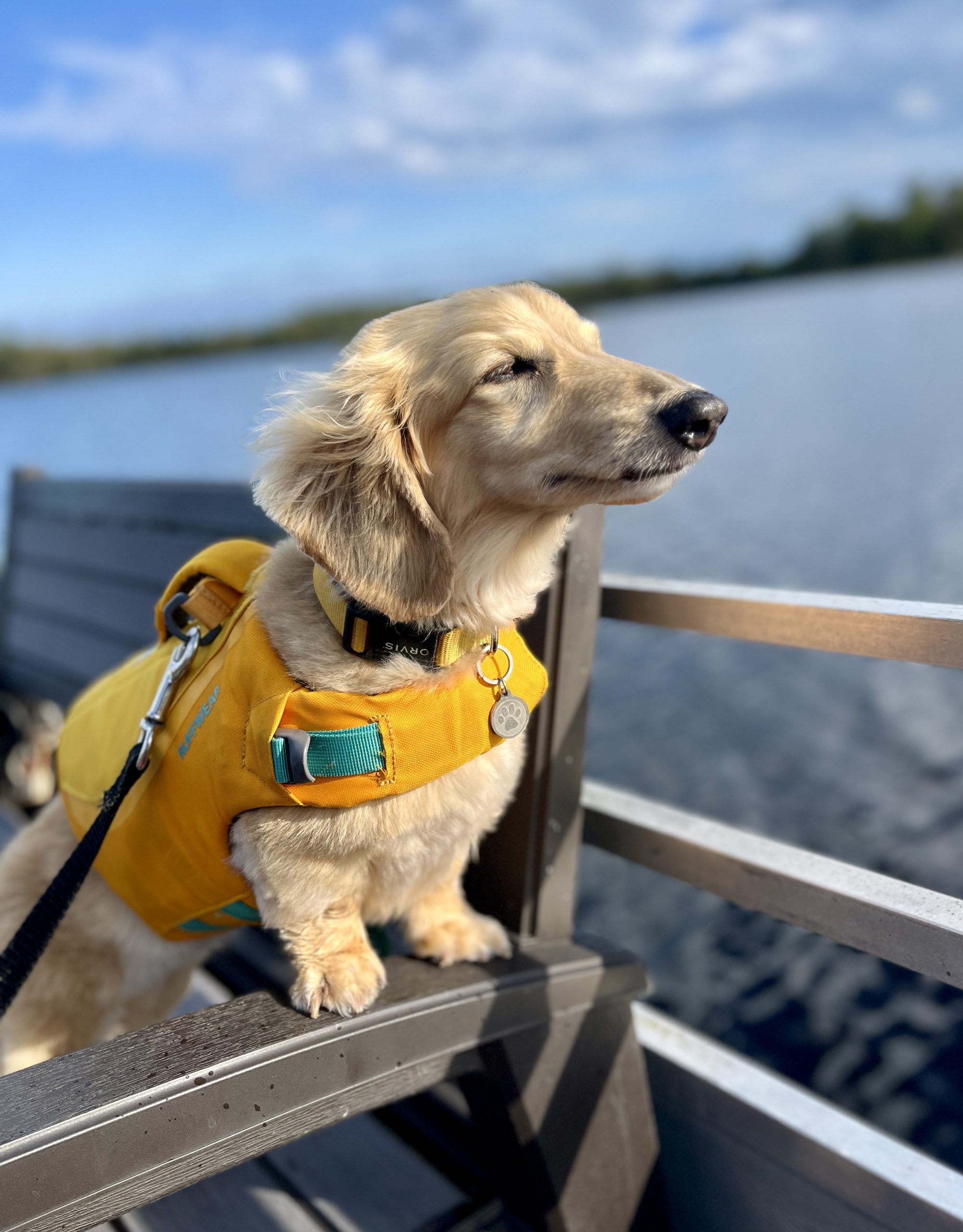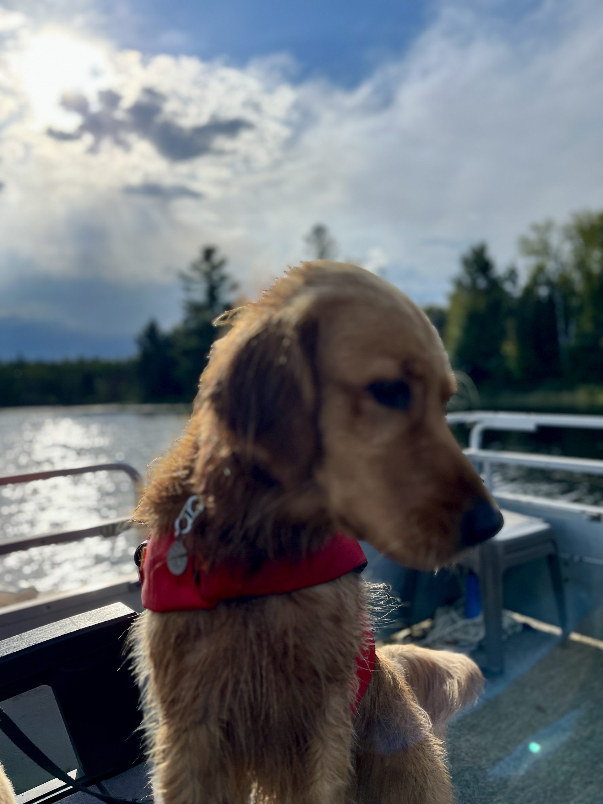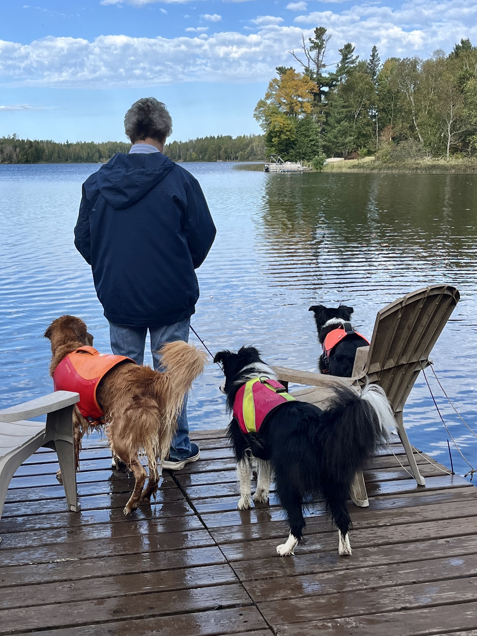 The weather has been beautiful and now that ‘the move’ is over, we all were able to have a peaceful day at the cabin. Taking the pontoon out for a long ride and casting a line from the dock were highlights for both us and the dogs. Bobber duty was taken seriously by all dogs except Helen, who was most concerned about swimming!