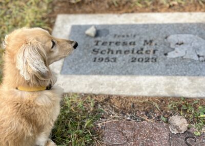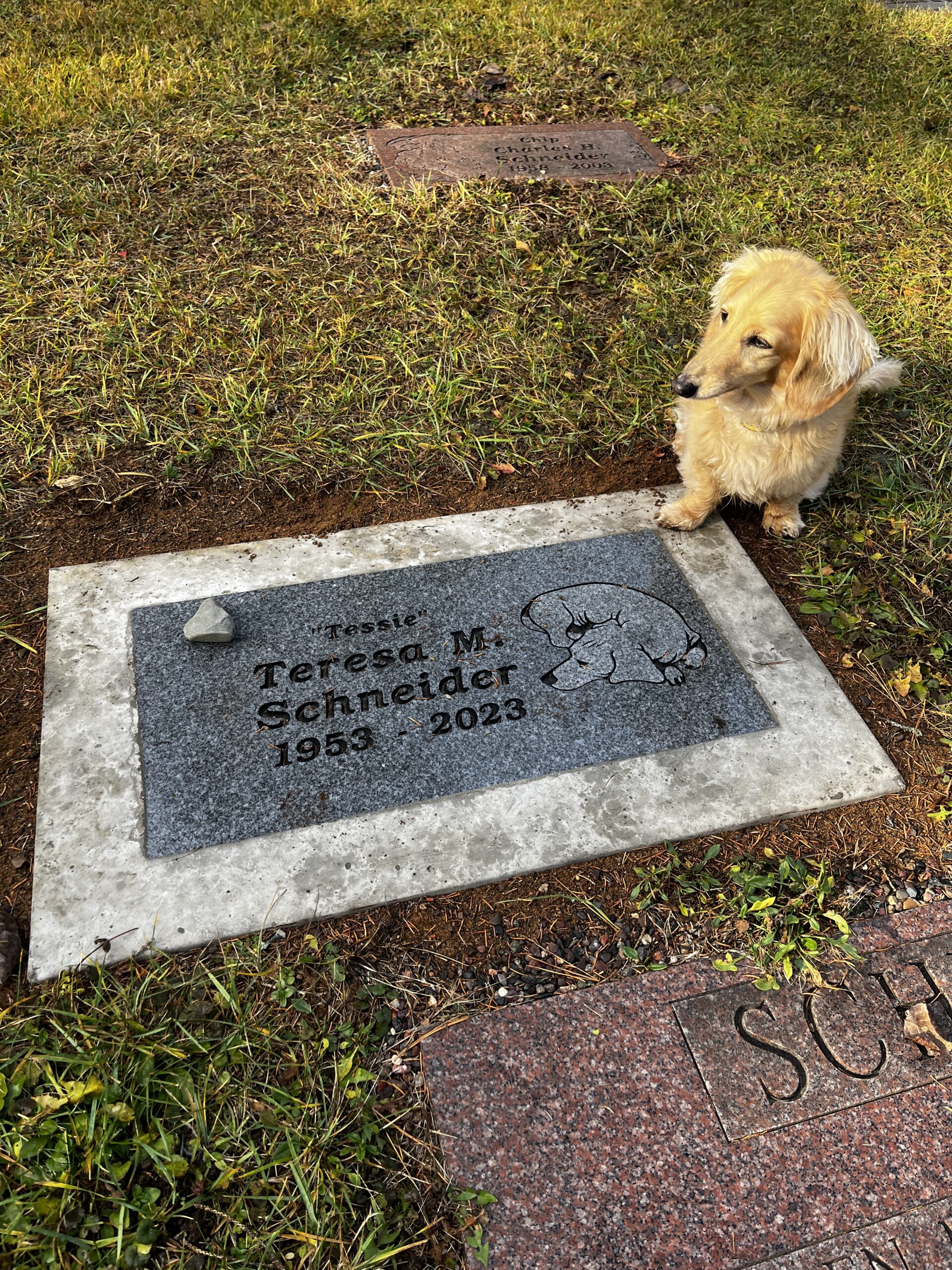 Our dear friend, Tessie, would have celebrated her 71st birthday this year. We had not seen Tessie’s cemetery marker so with Susie’s (Tess’s sister) directions from recall, we took a road trip to Cloquet to first find the cemetery, then find Tess. Our search was successful! DeeAnn & I took sections and panned the ground eventually spotting her full name, Teresa M. Schneider, and a few inches away an etching of little Helen. Helen loves her walks at cemeteries so she was excited and in good spirits being there. She heard Tess’s name being spoken aloud frequently in a short period of time but I didn’t pick up on any acknowledgement, no head tilting or whining. She seemed herself, as I know her. I was the one fighting a double whammy – seeing Tessie’s name engraved in stone and also Helen’s image on a marker. No doubt Tessie loved her Helen, and Helen loved Tessie. I know Helen adores her current family but I understand too there is no replacing her first mama. We are a placeholder for Helen until that time comes when she is with Tessie again. There will be plenty of stories for them to share when that day comes.