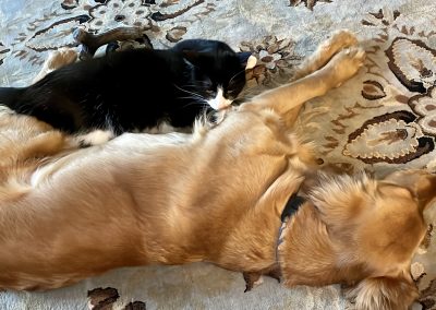 After seeing Santa, Holly was wound up, as was I, so we went for a long walk at Forest Hills Cemetery.  It was a nice early winter day and the ice has melted down so the paths are bare and dry.  We celebrated with a couple extra loops added to the walk.   The excitement of meeting Santa combined with an extra long walk tired Holly as I had hoped.  She rested peacefully for quite sometime on the living room rug, indeed so peacefully that she didn’t even react when Gracie sniffed her up and down, then stepped on her back walking over her to lay down as if spooning with Holly.  Holly laid still with her eyes open, I think not wanting to move and ruin the experience.  Meanwhile I think Gracie was doing it to entice Holly to get up, hoping she would head to the kitchen and get some supper action happening.