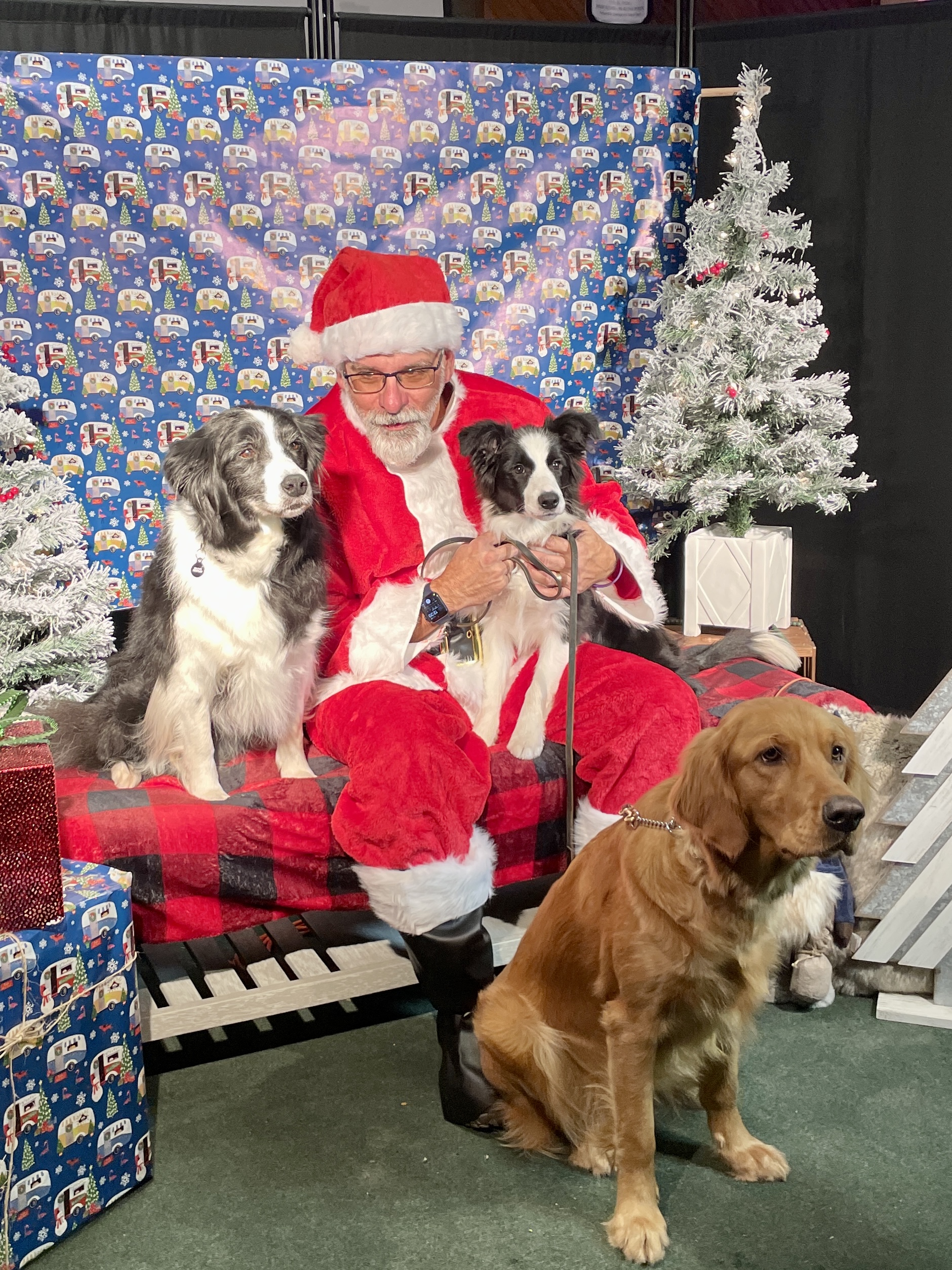 Holly & Keltie met Santa Claus today, while Rainie said hello and casually sat by his side while he tried to manage the excitement of the two puppies.  All of the dogs did awesome considering the factors involved – dog owners, dogs, bright lights, and little kids.  Santa was at the Caddy Shack Golf Center & Pub Bar in West Duluth – a first time for me as well.   I had Holly on a tight lead next to my chair and when another dog would walk by, she would show interest with a bit of a tail wag but when one of the children would walk by she would wag her tail excessively and pull to reach them.  Her love of children is so evident and consistent.