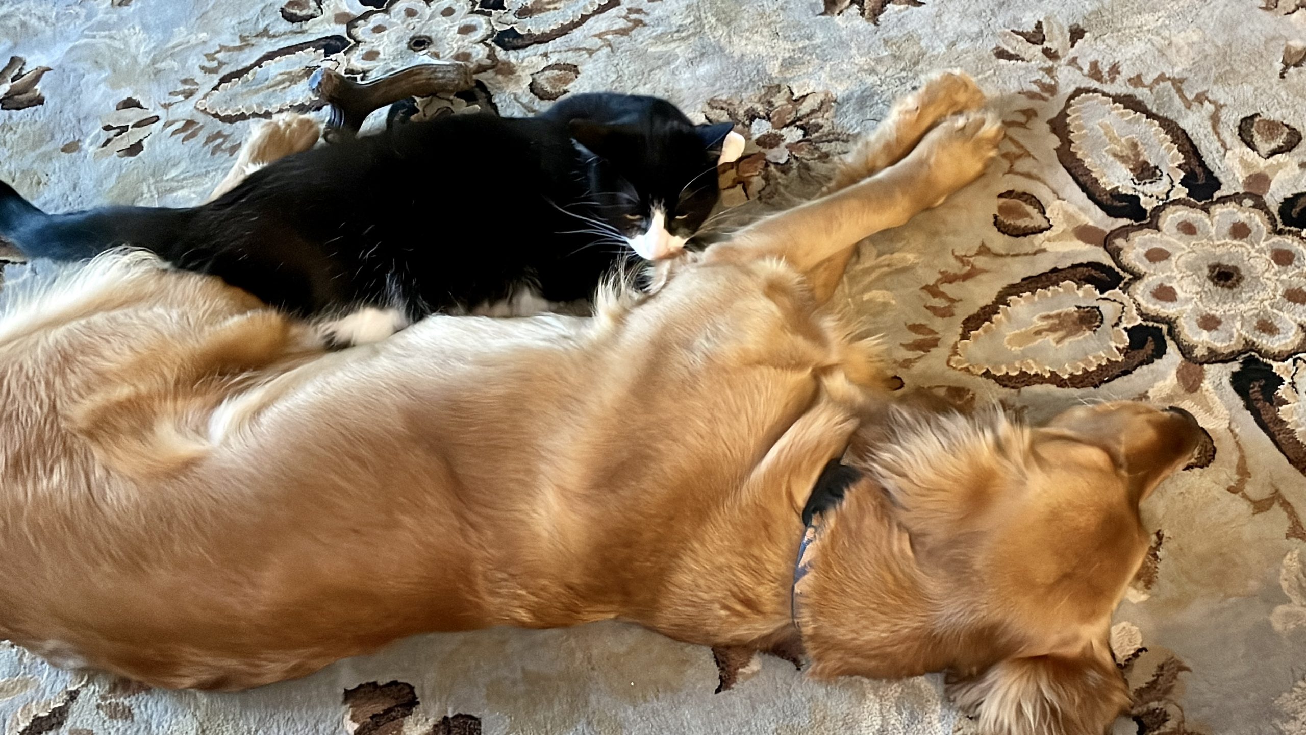 After seeing Santa, Holly was wound up, as was I, so we went for a long walk at Forest Hills Cemetery.  It was a nice early winter day and the ice has melted down so the paths are bare and dry.  We celebrated with a couple extra loops added to the walk.   The excitement of meeting Santa combined with an extra long walk tired Holly as I had hoped.  She rested peacefully for quite sometime on the living room rug, indeed so peacefully that she didn’t even react when Gracie sniffed her up and down, then stepped on her back walking over her to lay down as if spooning with Holly.  Holly laid still with her eyes open, I think not wanting to move and ruin the experience.  Meanwhile I think Gracie was doing it to entice Holly to get up, hoping she would head to the kitchen and get some supper action happening.