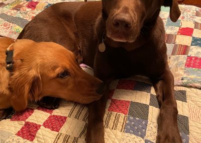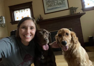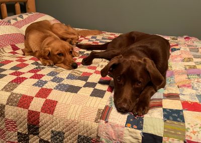 Eventually it was time for bed…our “Slumber Pawty”! I was told that Holly typically lays on the floor or on her bed. So we go upstairs to get ready for bed and I walk into the room to find two dogs on my bed! They were both so happy and proud of themselves. I just embraced it and snuggled right in. Holly did move to the floor but decided every hour or so that she would come check on me! I’m not sure where Gracie slept but she was smart and probably found a spot larger than I ended up with. There was a decent storm that night but all three fur babies did very well.