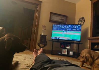 Next it was time for dinner. But first I was able to experience putting a diaper on Holly! She was so good about it and so proud once we accomplished it. The most difficult part was getting her tail in the hole…that tail didn’t stop wagging from the excitement of knowing Kooper was at her house. Holly, Kooper and Gracie all ate their dinners very well. By now I was exhausted and ready to unwind but the fur babies had other ideas. Gracie sat on her window bed and watched the craziness that had entered her home. Holly was determined to play with an inside ball. Kooper was ready to just chill. And I was ready to eat and relax after a long day at work. So we compromised. The pups played for a few while I ate then we turned on the MN Twins game and laid on the floor together. Kooper on my left just relaxing and watching TV and Holly on my right ready to play ball. My left hand was petting a dog while my right hand was continually throwing a ball. I was able to relax, watch the Twins win and be with three amazing fur babies!
