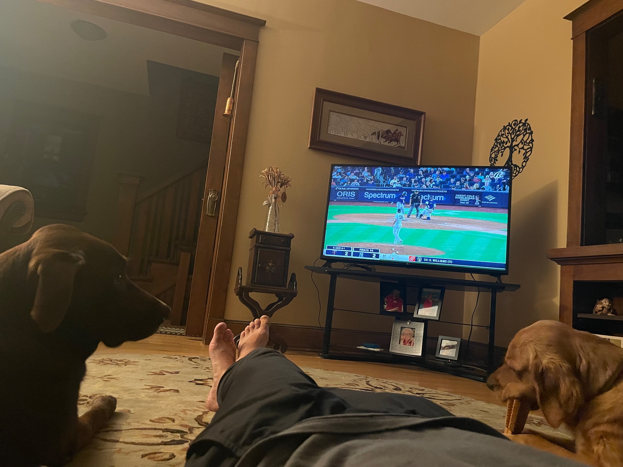 Next it was time for dinner. But first I was able to experience putting a diaper on Holly! She was so good about it and so proud once we accomplished it. The most difficult part was getting her tail in the hole…that tail didn’t stop wagging from the excitement of knowing Kooper was at her house. Holly, Kooper and Gracie all ate their dinners very well. By now I was exhausted and ready to unwind but the fur babies had other ideas. Gracie sat on her window bed and watched the craziness that had entered her home. Holly was determined to play with an inside ball. Kooper was ready to just chill. And I was ready to eat and relax after a long day at work. So we compromised. The pups played for a few while I ate then we turned on the MN Twins game and laid on the floor together. Kooper on my left just relaxing and watching TV and Holly on my right ready to play ball. My left hand was petting a dog while my right hand was continually throwing a ball. I was able to relax, watch the Twins win and be with three amazing fur babies!