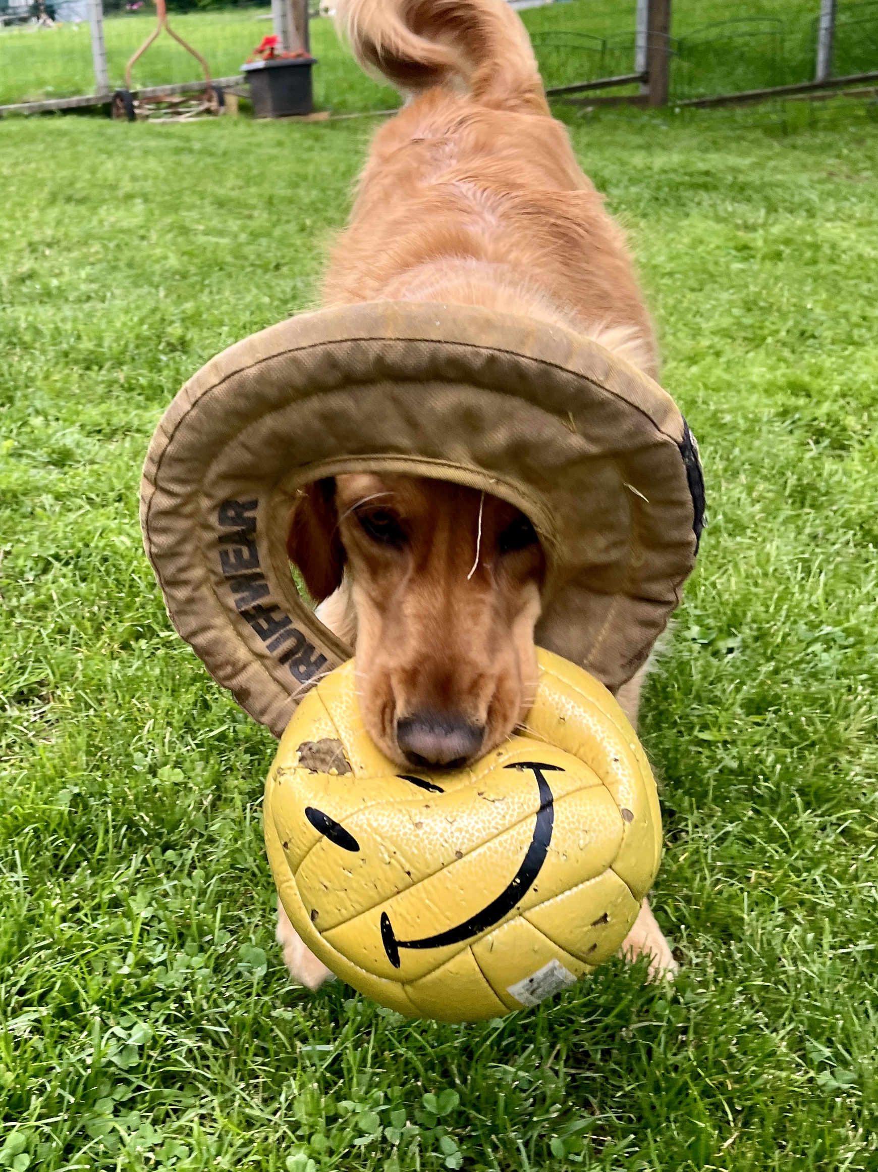 Communities are in midst of clean up and restoration from the heavy rains and subsequent floods. My hardship has been keeping up with the green growing grass that is loving this frequent combination of rain and sun. Holly is loving the extra outdoor time that comes with longer days and warmer temps. I’ve noticed she tends to be more content when outside, often sitting in the shade with her soccer ball close by. She gives glances towards Luna’s yard, looking for the kids to appear; then gives glances towards Donna’s yard, looking for the grandparents to appear. She has both of them trained to give a wave and greeting and occasionally walk over for a quick game of fetch. She has figured out the path of a lawn mower and strategically plants the ball in position that forces me to stop mowing to deal with it. My frustration leads me to chucking the ball as far as I can, which of course only leads to the ball being squarely in front of the lawn mower shortly after.