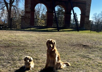 Close to my home is Old Main Park, basically a large field where the former Old Main UMD Building once stood. A nasty fire consumed the building in the early 2000’s. Salvaged was the monumental arches from three sides of the building. It’s been the backdrop of many wedding, graduation and prom pictures. We visit Old Main often. I think Holly considers it her own backyard, so much so that I drive Holly there in the car so she doesn’t learn the walking route. It’s 1/2 block away from the house. The arches survived a fire and have withstood the test of time – still standing and serving as a memory marker for many students, families and neighbors. Now where the building once stood is a large flat grassy area that provides a makeshift soccer field for young athletes, a peaceful setting for picnicers and ponderers, and a dream frisbee field for dogs and their peep’s. The fire burned the building down, but it couldn’t take away the setting for community, reflection and joy.